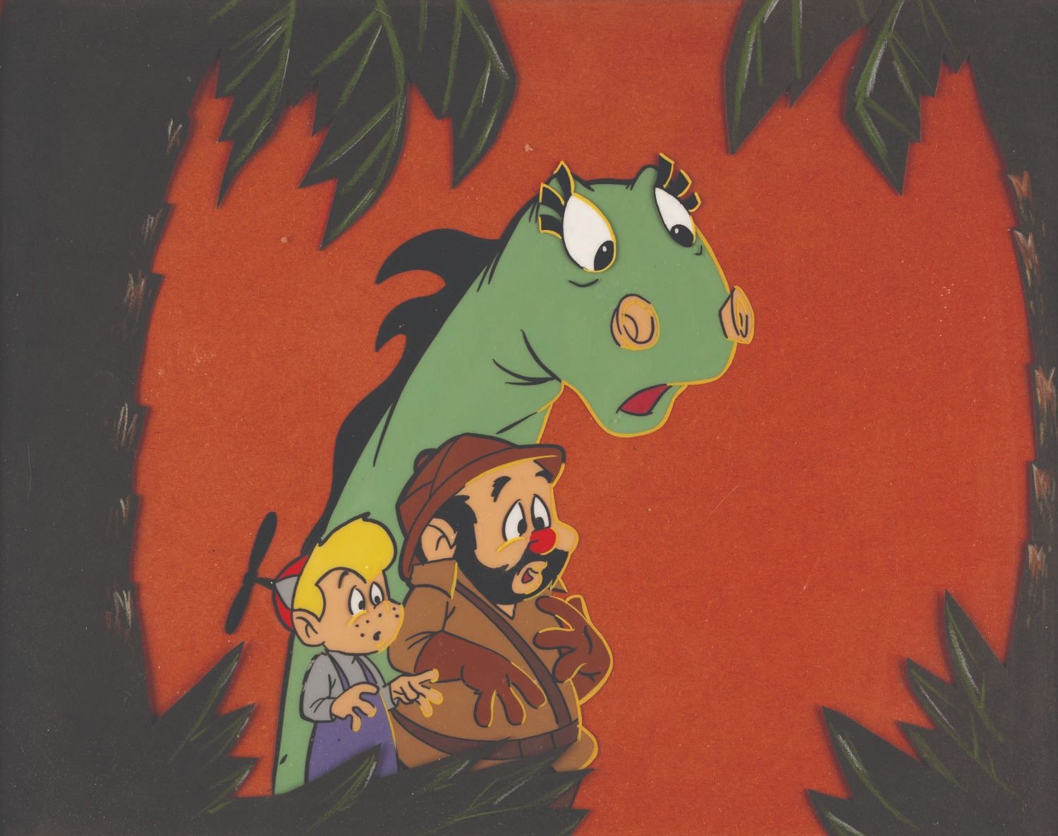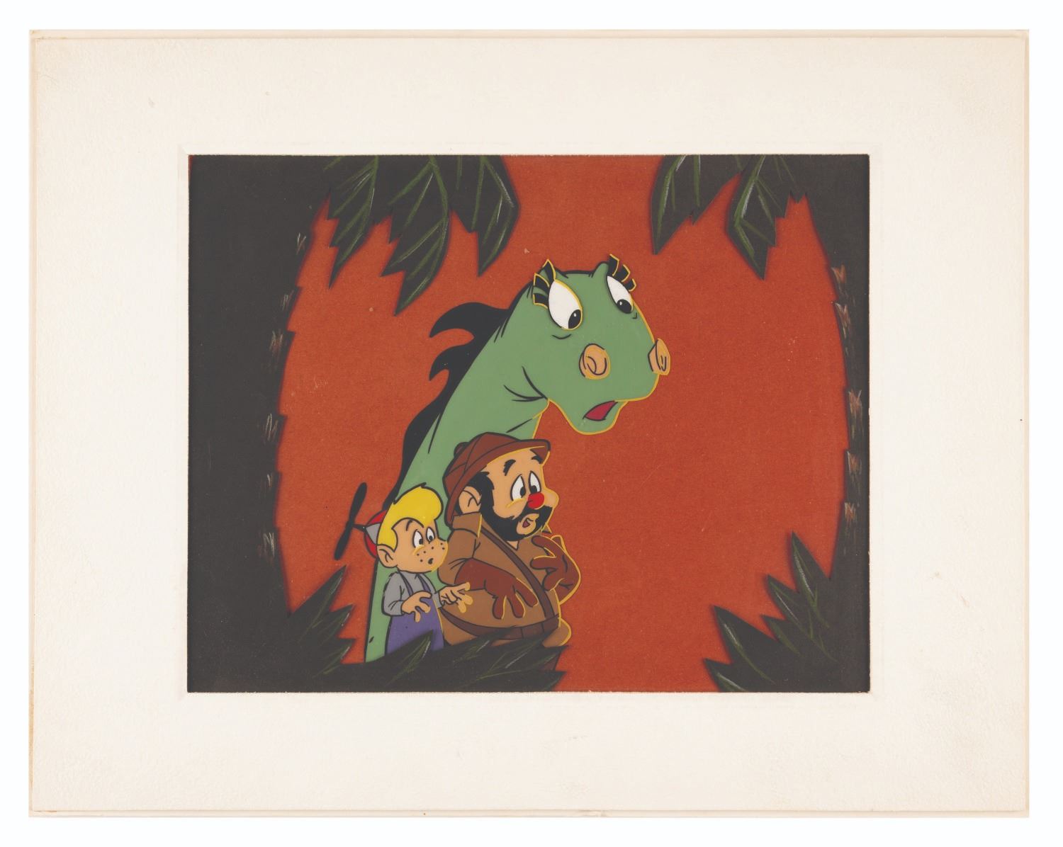 (Clampett, 1962) An original “Beany and Cecil” multi-layer hand-painted production cel featuring Beany, Cecil, and Captain Huffenpuff. Measuring 7.5” x 9.5” in an 11” x 14” matte, the piece displays in very good condition with light line loss and discoloration to the matte from age.