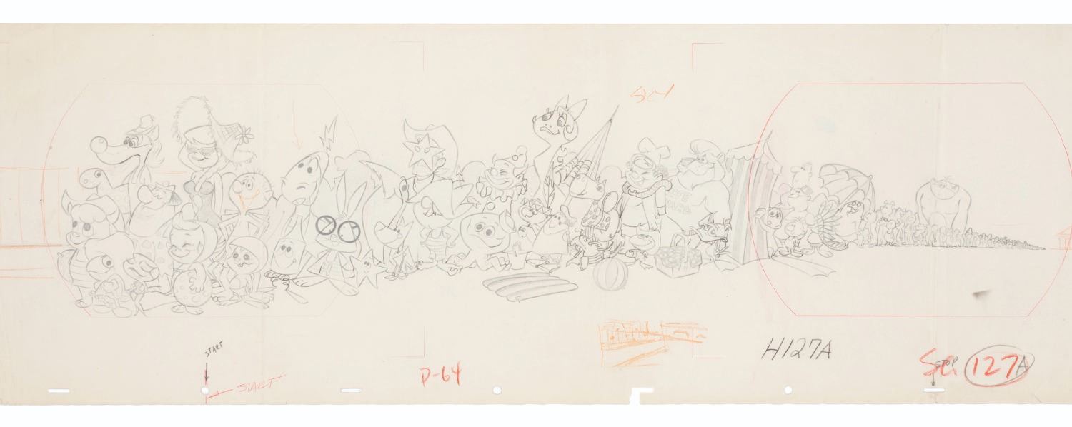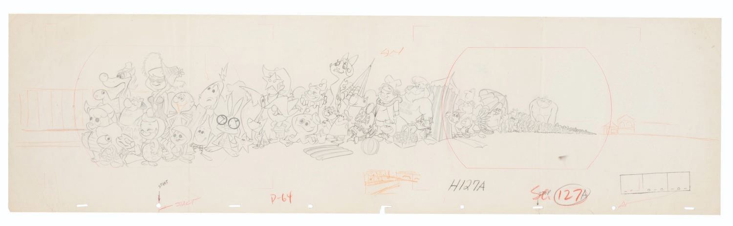 (Clampett, 1962) A “Beany and Cecil” pan layout drawing from the episode “Dirty Pool.” The drawing features the return of over 25 one-shot characters from the series. Measuring 10.5” x 37.5”, the graphite drawing is in good condition with light edge wear and creasing from production use, a tear to the center peg hole, a 1.25” tear to the bottom left edge, and three horizontal folds.