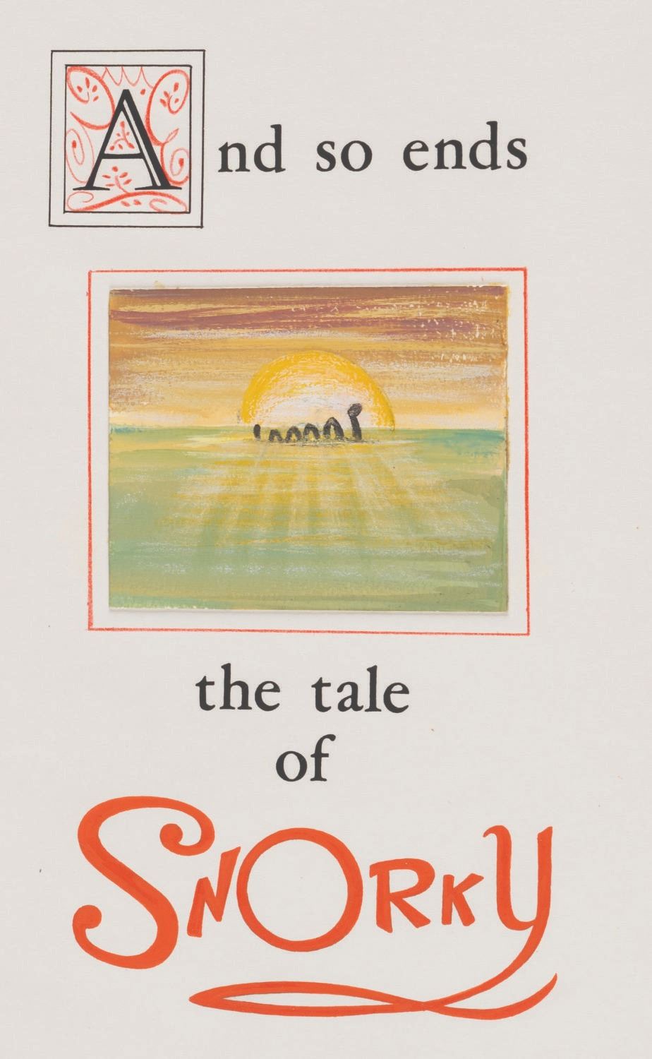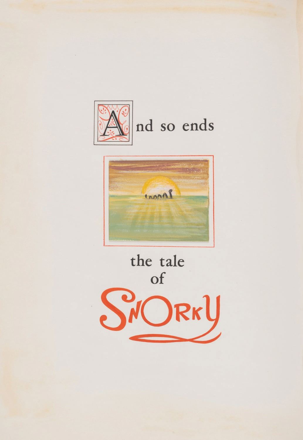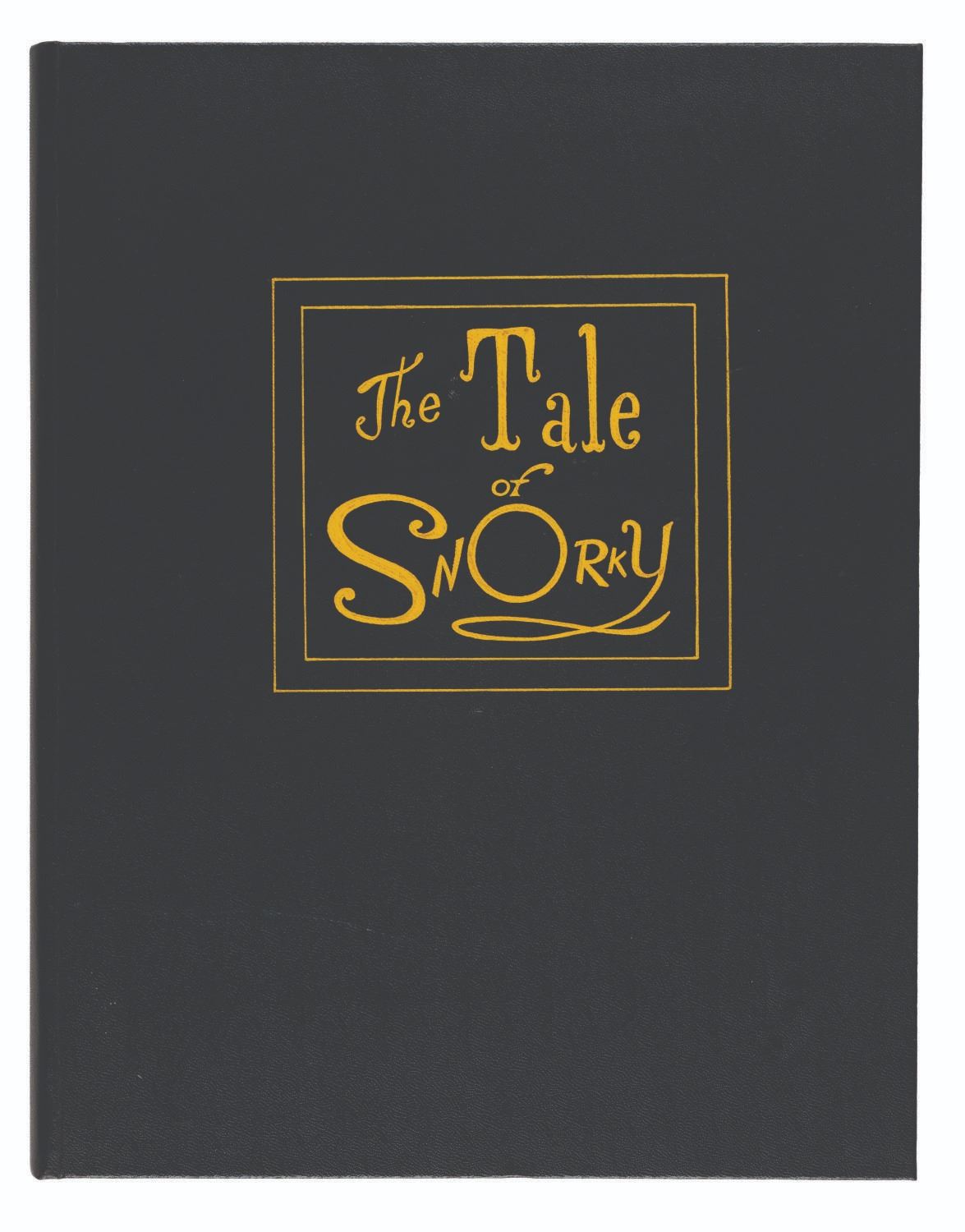 (Clampett, 1962) A “Tale of Snorky” prop book used for the live-action scenes in the “Beany and Cecil” episode “There’s No Such Thing as a Sea Serpent.” This was the final episode of the series and introduced the character of “Snorky” whom Bob Clampett had developed earlier for a proposed puppet show called “Beeper and his Guided Muscle.” The hardcover book with a custom-painted front and back cover contains the five illustrated pages seen in the episode as well as four pages of preliminary text. Measuring 11” x 8.75” x 0.75” thick, the screen-used book is in very good condition with two detached but included pages and light discoloration from age.