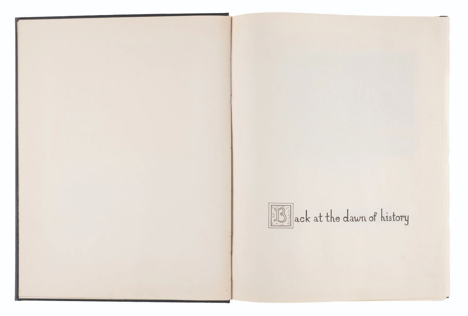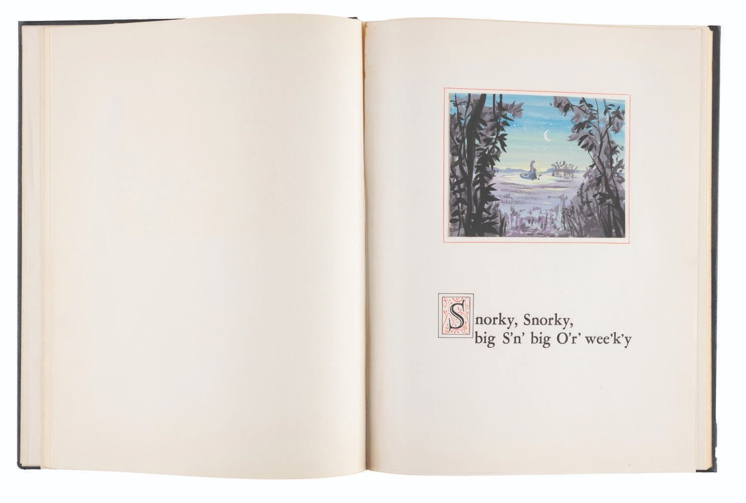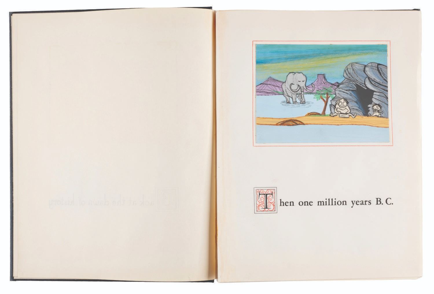 (Clampett, 1962) A “Tale of Snorky” prop book used for the live-action scenes in the “Beany and Cecil” episode “There’s No Such Thing as a Sea Serpent.” This was the final episode of the series and introduced the character of “Snorky” whom Bob Clampett had developed earlier for a proposed puppet show called “Beeper and his Guided Muscle.” The hardcover book with a custom-painted front and back cover contains the five illustrated pages seen in the episode as well as four pages of preliminary text. Measuring 11” x 8.75” x 0.75” thick, the screen-used book is in very good condition with two detached but included pages and light discoloration from age.