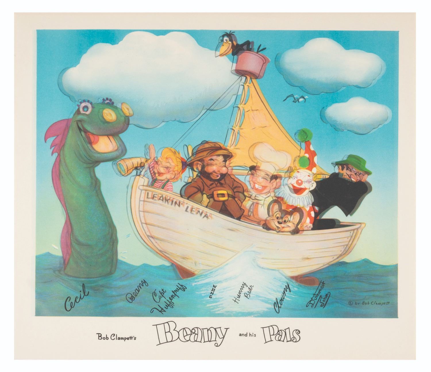 (Clampett, 1950s) A Bob Clampett’s “Beany and his Pals” fan card with Beany, Cecil, Capt. Huffenpuff, Clowny, Crowy, Hopalong Wong, Hunny Bear, and Dishonest John. This piece was printed incorrectly as the colors and lines are misaligned. Measuring 8.5” x 11”, the card is in fine condition.