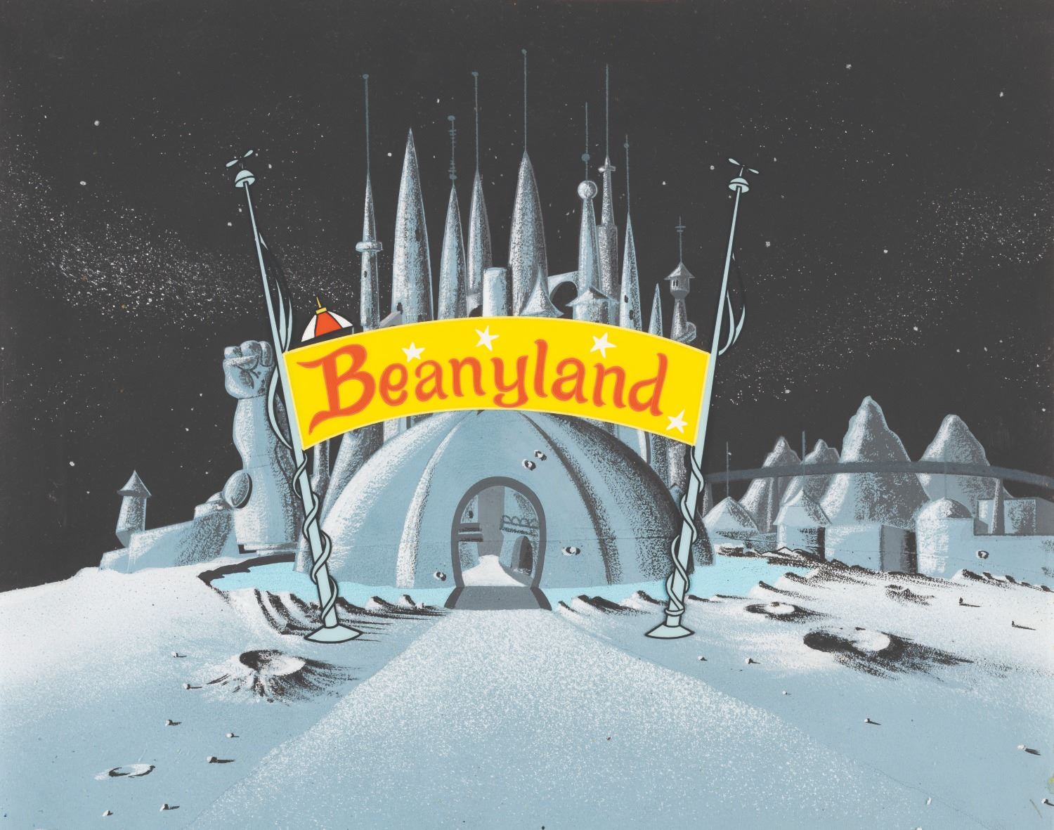 (Clampett, 1962) An original “Park at the Top of the Stars” production background and cel of Beanyland. The park was redesigned here to less resemble Disneyland, with castle spires unlike Sleeping Beauty’s castle, the “Guided Muscle” on the left replacing a close match to Tomorrowland’s “Rocket to the Moon”, and the train station outside of the entrance removed. Measuring 10.5” x 12” each, the hand-painted cel and background display in very good condition with light signs of production use and adhesive residue and pinholes along the edges which do not affect the image area.