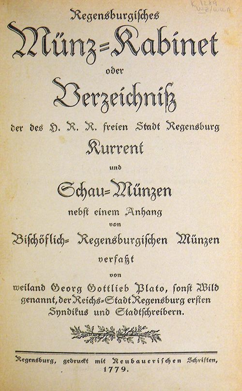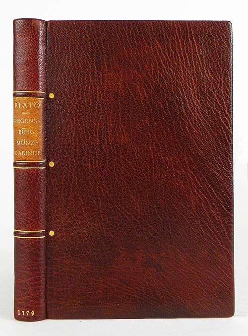Plato, Georg Gottlieb. REGENSBURGISCHES MÜNZ-KABINET ODER VERZEICHNISS DER DES H. R. R. FREIEN STADT REGENSBURG KURRENT UND SCHAU-MÜNZEN NEBST EINEM ANHANG VON BISCHÖFLICH- REGENSBURGISCHEN MÜNZEN. Berlin, Neudruck 1921. 12mo, handsomely bound in modern brown levant full morocco, gilt; spine with three raised bands, gilt, light brown lettering piece, gilt; marbled endpapers. (14), 220, (8) pages. Fine. A lovely copy of the old classic work, still widely consulted. Clain-Stefanelli 9519*. Ex Stack's Numismatic Library.