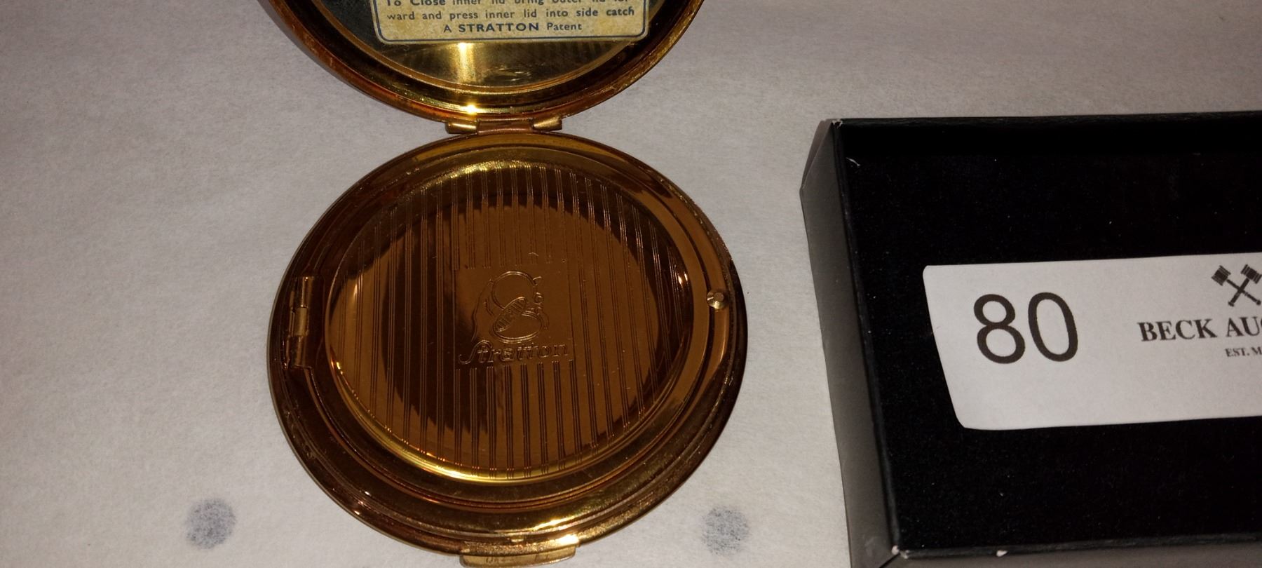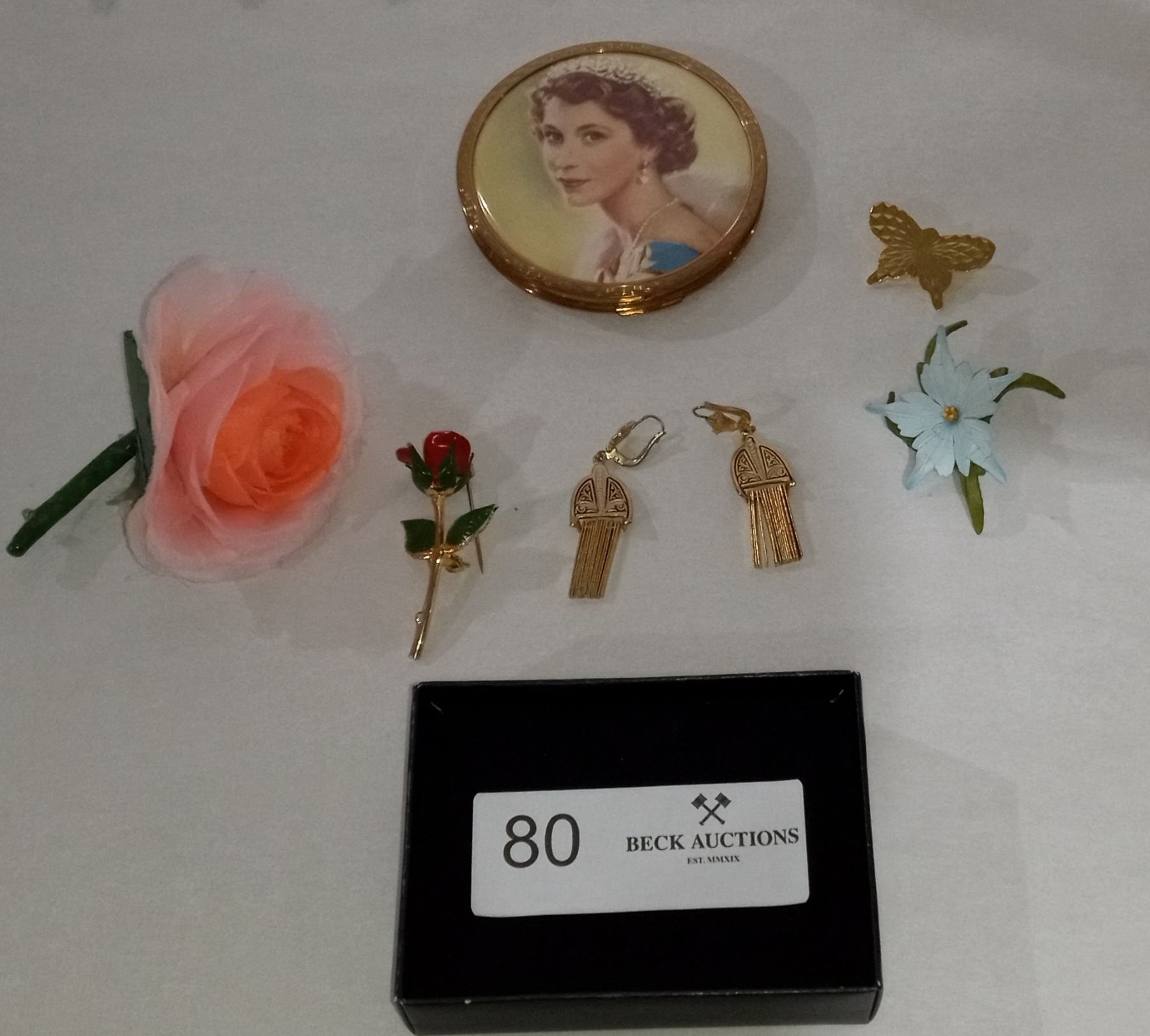 A Beautiful Makeup Compact featuring Her Majesty: Queen Elizabeth; including 2 Beautiful Gold-Plated Costume Earrings, 1 Gold-Plated Rose Pin, 1 Plastic Rose Pin, 1 Blue Flower Pin, and 1 Gold-Plated Butterfly Pin.