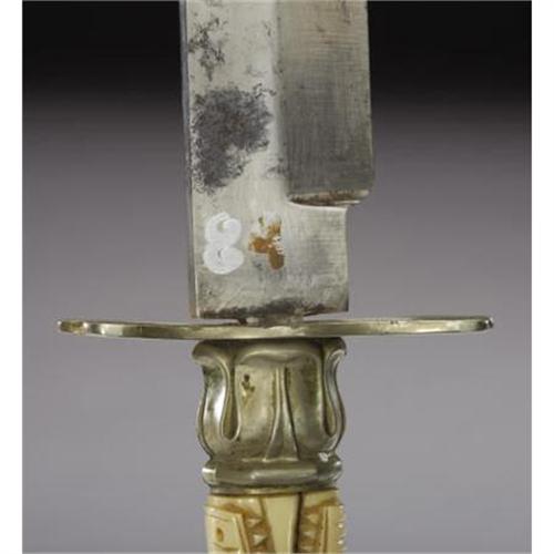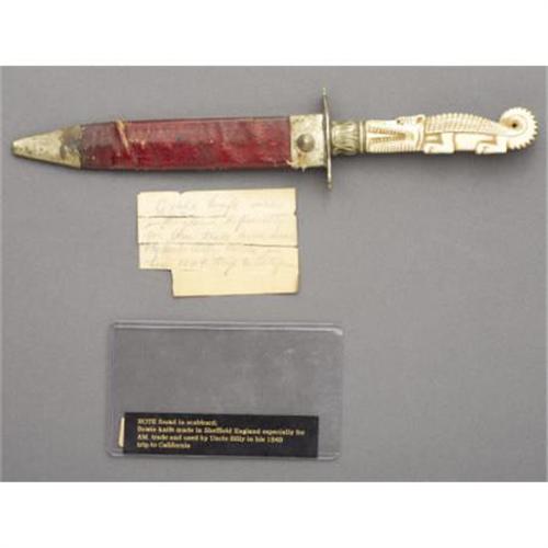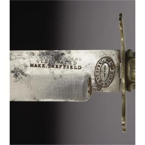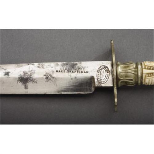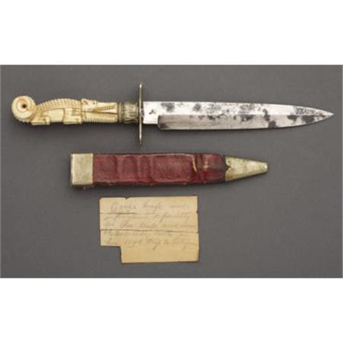 <B>A BEAUTIFUL RODGERS BOWIE KNIFE WITH AN IVORY HANDLE IN THE FORM OF AN ALLIGATOR CIRCA 1840 - USED BY UNCLE BILLY IN THE GOLDFIELDS IN 1849 TRIP TO CALIFORNIA<BR></B></I>This is an extraordinary Bowie knife from the famous James Rodgers knifemakers of Sheffield, England. Stamped 'Rodgers, Celebrated Make, Sheffield' at 1" down the 7" blade, the maker also stamped the rarely found 'Cast Steel Bowie Knife' in an oval at the ricasso of the 1" wide blade. The most incredible part of the knife is the elaborately carved 4 1/2" ivory grip made into the form of an alligator. The animal has an upturned tail at the base and open mouth gripping the tulip-shaped brass crossguard which terminates in a fleur de lis. The craftsman at Rodgers who made this knife even added mother-of-pearl eyes to the alligator which are intact. The handle has an approximately 1" surface crack just behind the alligator's mouth on the right side. The red Moroccan leather scabbard still has evidence of gold tool work and has minor flaking to the leather and a slight buckle at 1" above the 1 1/2" brass tip. The 3/4" block-shaped brass throat has the original brass frog intact. Measuring just over 12" overall, this knife is an extremely rare artifact from a noted knifemaker. A handwritten period note found inside the sheath reads as follows: <I>"Bowie knife made in Sheffield England and used by Uncle Billy in his 1849 trip to California Goldfields"</B></I>. One of only three known to exist.<I> From The William Turner Collection.</B></I><BR><BR><b>Shipping:</b> Bats, Clubs, Sticks, Swords, Rif (<a target="_blank" href="http://www.heritageauctions.com/common/shipping.php">view shipping information</a>)