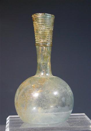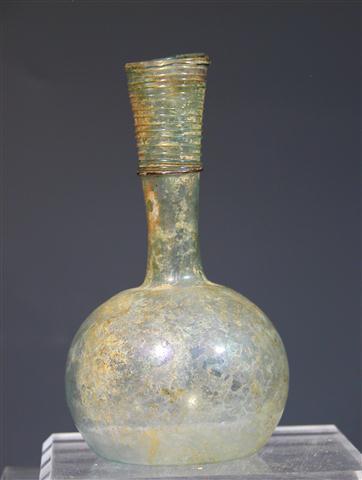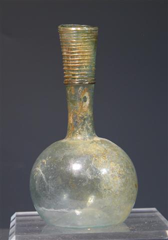 Ancient Rome, ca. 3rd century from the Roman-occupied Holy Land. Lovely, almost colorless bulbous glass vase with long slightly flaring neck on which a series of added glass threads have been applied. 6"H.