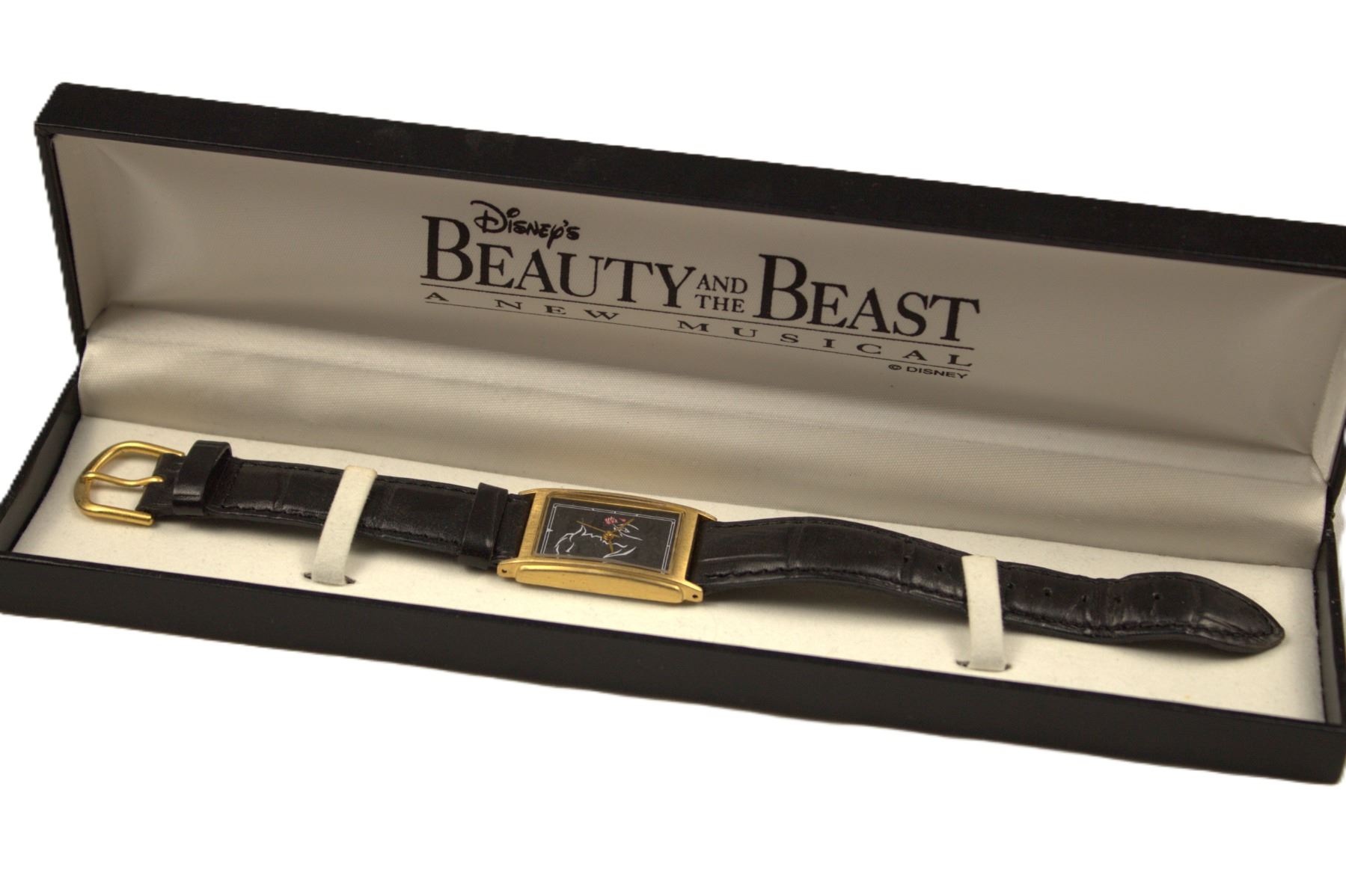 This Timex watch celebrates the Broadway musical Beauty and the Beast, A New Musical. The band is 8.5" long and features a gold bezel with black watch face with a Beast side profile holding a red rose. It is in good condition and comes in its original box.