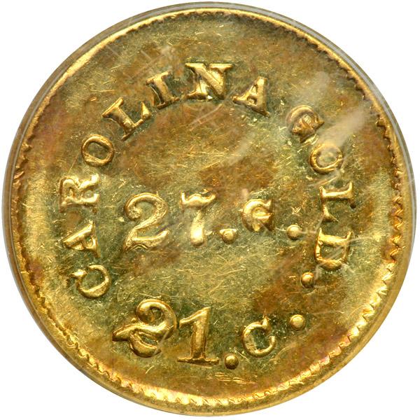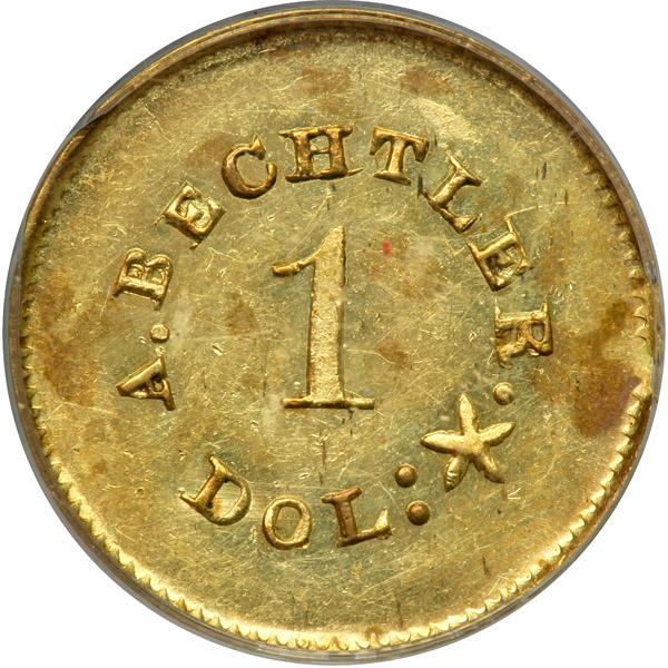 August Bechtler, 1 DOLLAR CAROLINA, 27 gr. 21 carats. PCGS graded MS-63. A wonderful bold strike with prooflike surfaces. Some areas of scattered toning starting to form.