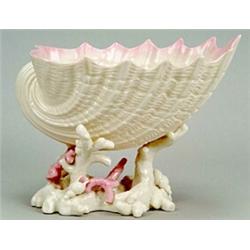 A Belleek First Period 'Imperial Shell' vase, modelled as a shell supported on a coral and seashe...