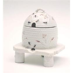 A Belleek first period honey pot and cover, moulded in the form of a bee-hive and painted with bees, on three stump feet, black painted mark, 6ins (see illustration) £700-900
