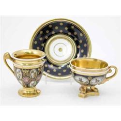 A Berlin teacup and saucer, cup with seed-pearl border finely painted with figures on horseback within ovals against a royal blue border, on triform claw feet, and a near-matching pedestal coffee cup painted with flowers and country buildings £100-150