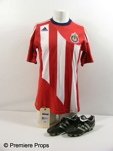 Luis (José Julián) screen worn, red short sleeve crew neck with white striping and 'Chivas' patch on the front MLS 'Adidas' jersey, (size M) and black with silver stripes 'Adidas' soccer cleats. (size 9) Includes wardrobe tag!