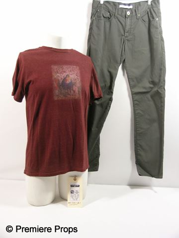 Luis (José Julián) screen worn, hero, maroon short sleeve crew neck with Virgin Mary logo on the front 'Mossimo Supply' t-shirt, (size M) and grey slightly worn on the front 'Standard Cloth' pants. (size 33) Includes wardrobe tag!