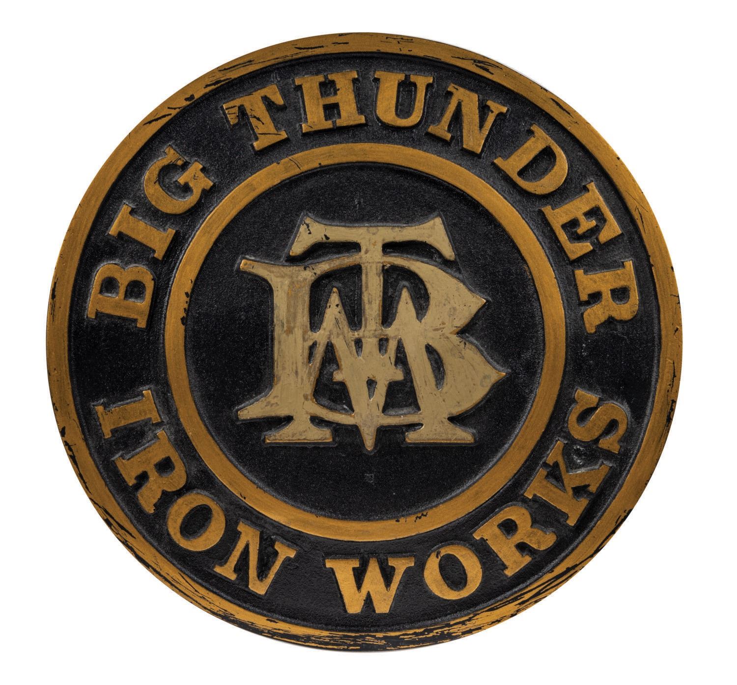 (Disneyland/Walt Disney World, 1970s-80s) A Big Thunder Iron Works builder's plate prop prepared for Big Thunder Mountain Railroad at Disneyland and Walt Disney World. The curved plate has been crafted in acrylic, painted, and distressed for appearance, and has the number MTV535 impressed on the reverse. Measuring approximately 8" in diameter, the prop is in very good condition, with minor wear from use and display.