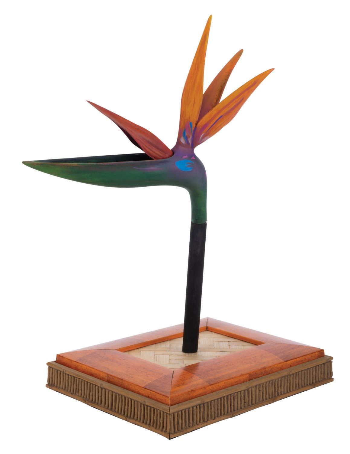 (Disneyland, 2000s) A Bird of Paradise prop from either Walt Disney's Enchanted Tiki Room at Disneyland or the Tropical Serenade at Walt Disney World. The flower head is hand-painted in bright colors and mounted to a custom tropical base. The entire piece measures 18.5" tall on a 11.5"x9.25" base and is in fine Park-used condition with little wear.