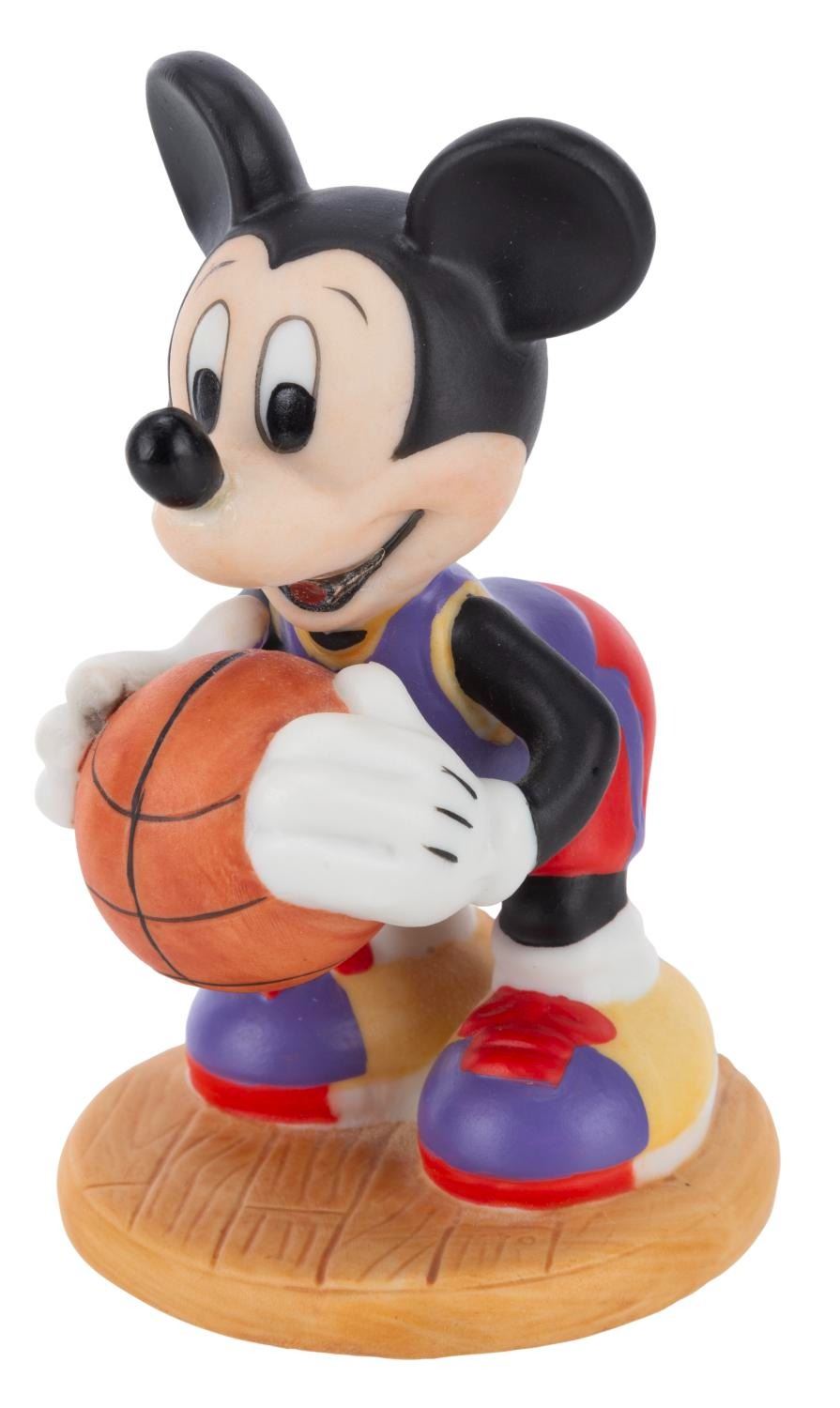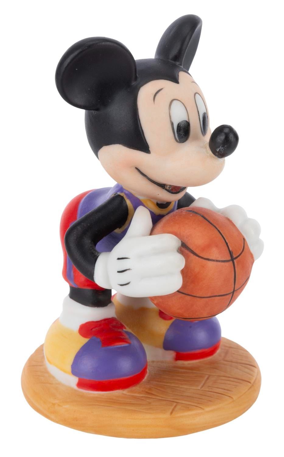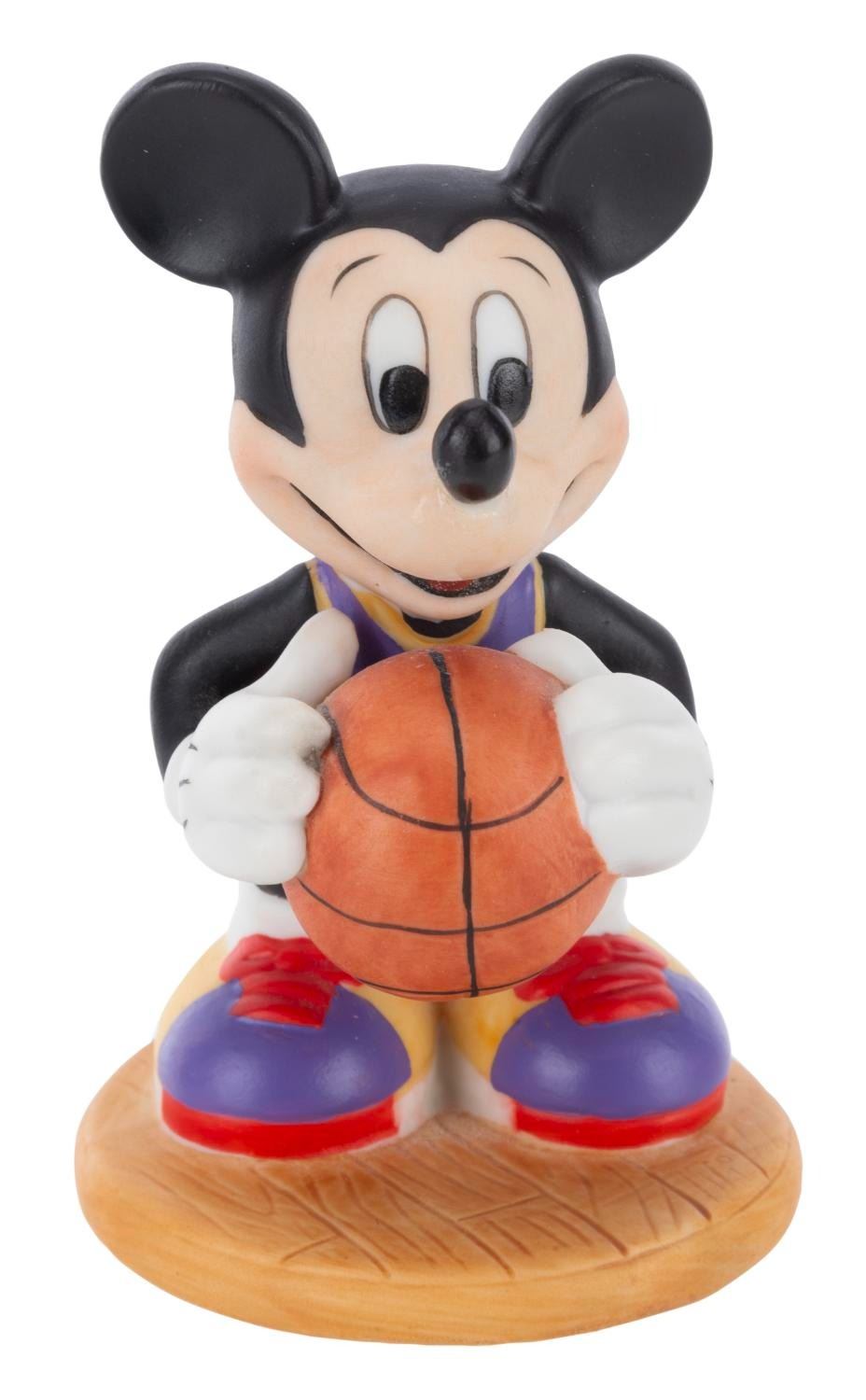 (Disney, 1980s-90s) A bisque porcelain figurine of Mickey Mouse playing basketball. Measuring 3.5” tall, the figurine displays in very good condition with light glue residue from repair to a crack on the nose.