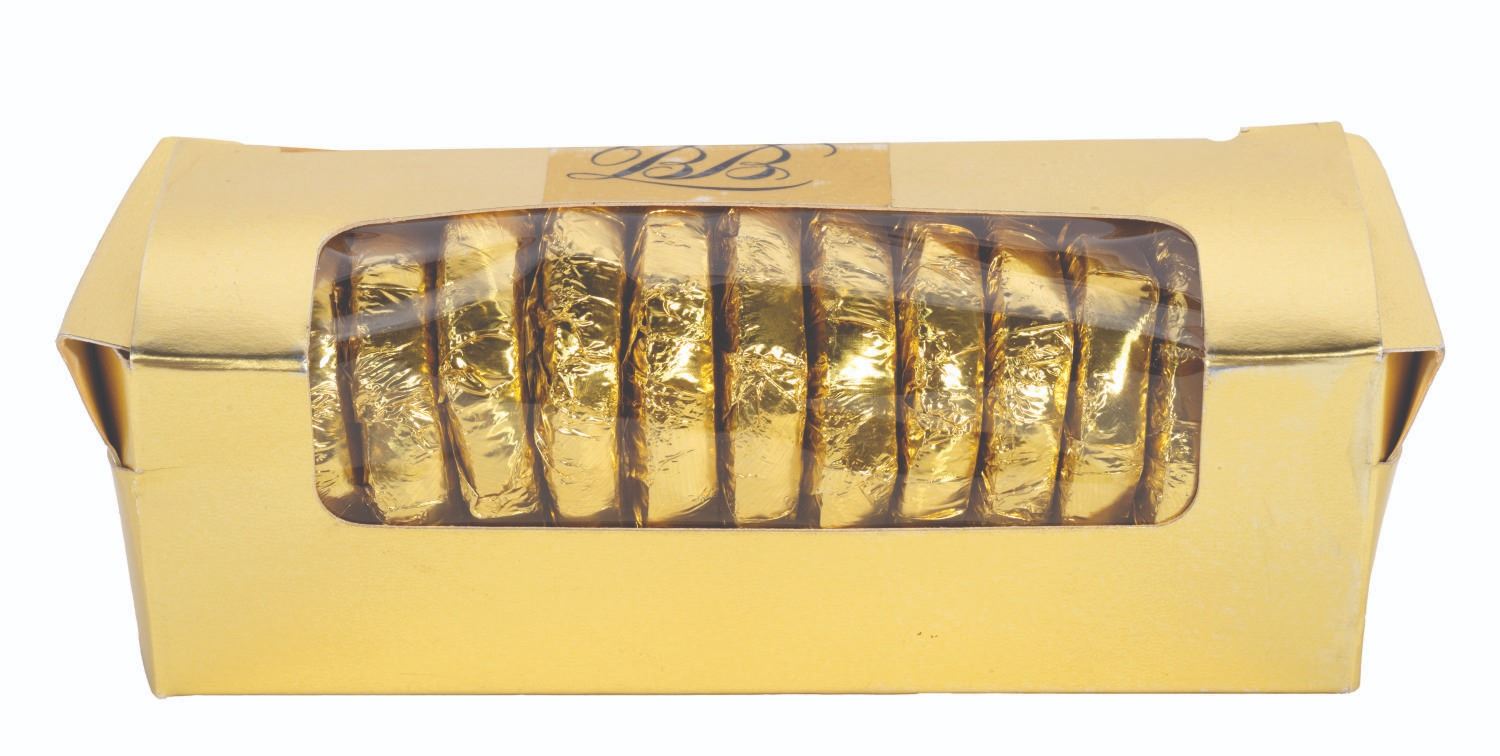 (Disneyland, 2000s) A box of coin-shaped chocolate mints from the Blue Bayou Restaurant located in New Orleans Square. The chocolates are for collecting purposes only, not consumption. Housed in a 1.75" x 5.25" gold box with a Blue Bayou sticker, the box is in good condition with discoloration from age, smudges, and sticker residue on the top.