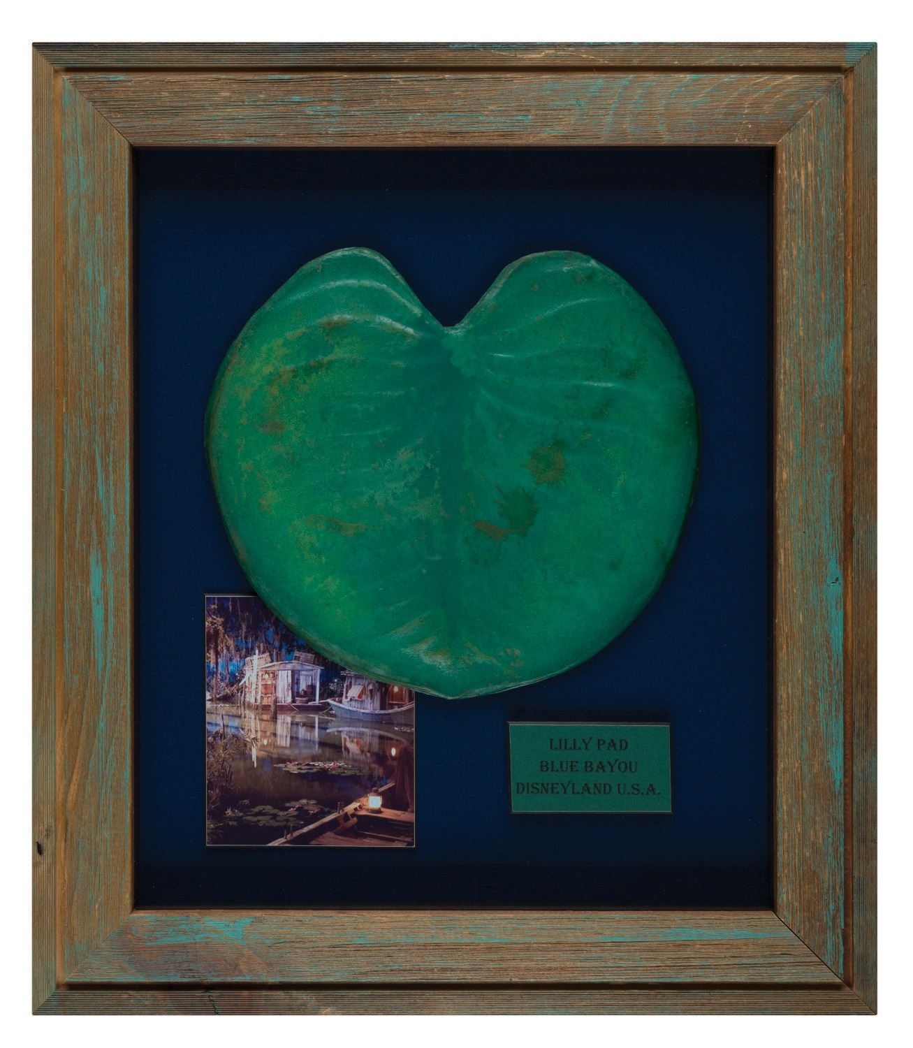 (Disneyland, 1980s) A Blue Bayou Restaurant Lily Pad Prop. Props of this style decorate the Blue Bayou Restaurant Swamp Stage and contribute to the serene show setting of the first scene for Pirates of the Caribbean. The lily pad has been mounted inside a rustic-finish wooden shadowbox frame for display. Measuring 9.25"x8.5", the hand-painted plastic prop is in fine Park-used condition with minor weathering and wear.