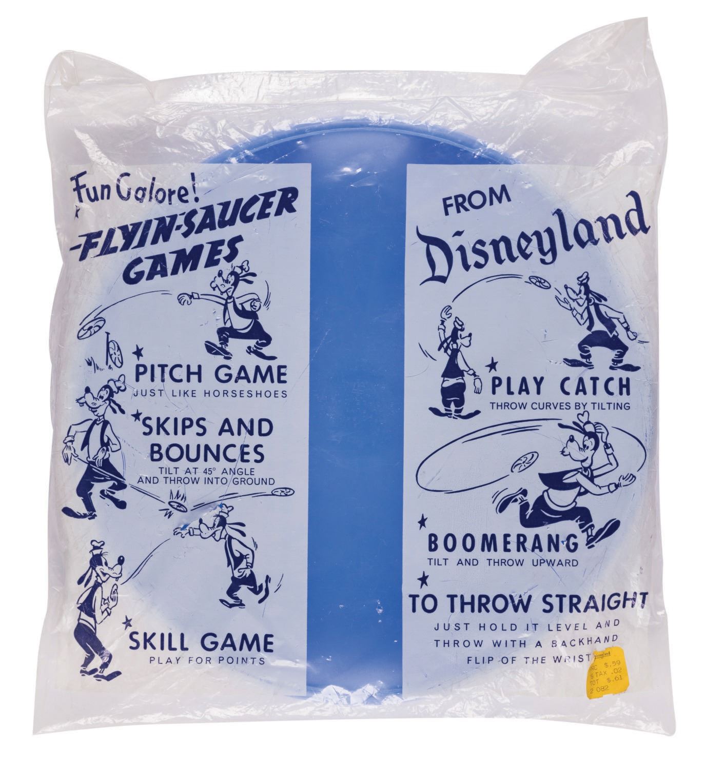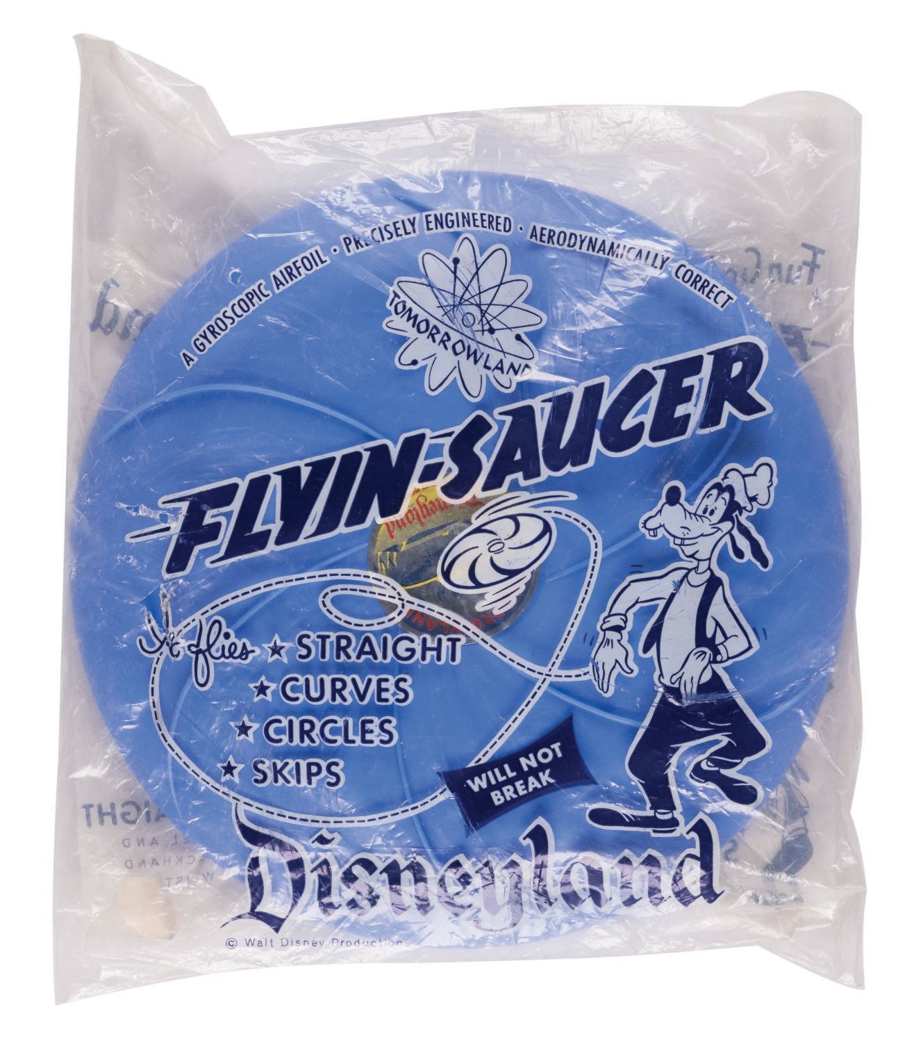 (Disneyland, 1955) A very rare "Flyin-Saucer" souvenir toy from Disneyland. This blue saucer comes ealed in its original packaging and a sticker loose from the center with pre-opening Imagineering imagery of Tomorrowland. The saucer measures 9.5" in diameter and is in fine condition, and typical wear to the packaging.