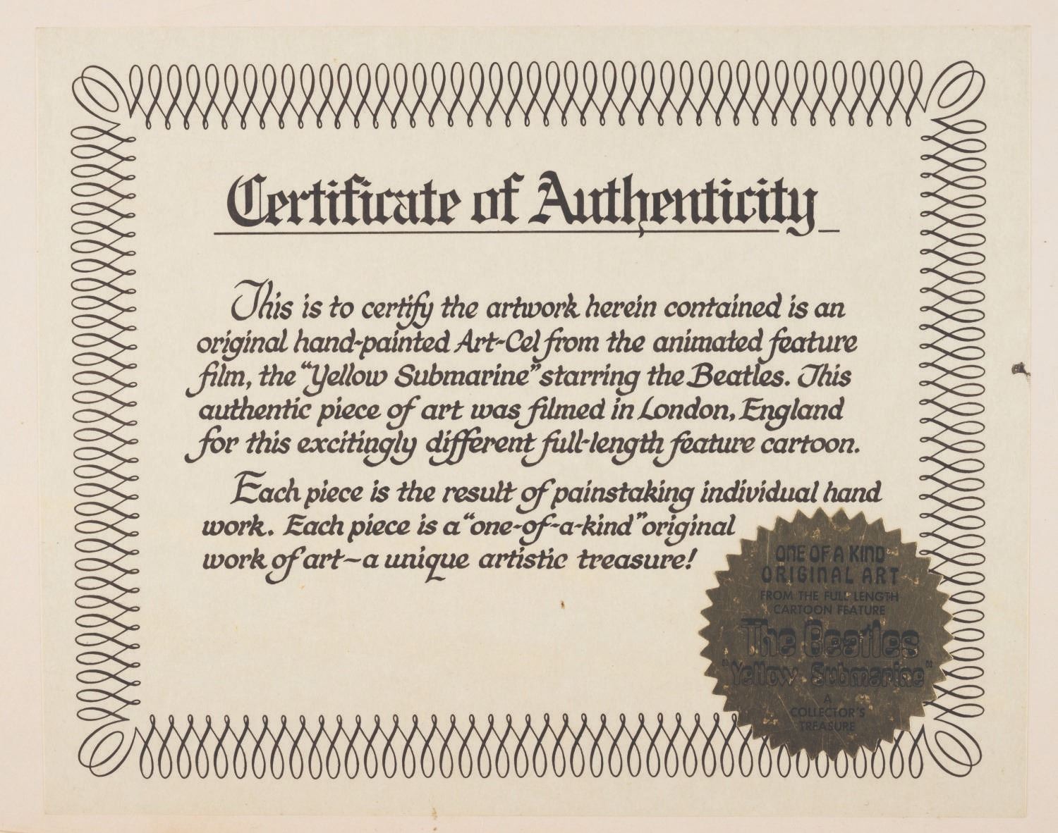 (United Artists, 1968) An original hand-painted production cel of a Blue Meanie from "Yellow Submarine.” With a character image size measuring 5.75” x 5.5” on an 11.25” x 15.25” visible cel in a 16” x 20” matte, the cel, sealed in its original retail wrapping displays in very good condition with light warping and staples in the top corners which do not affect the image.