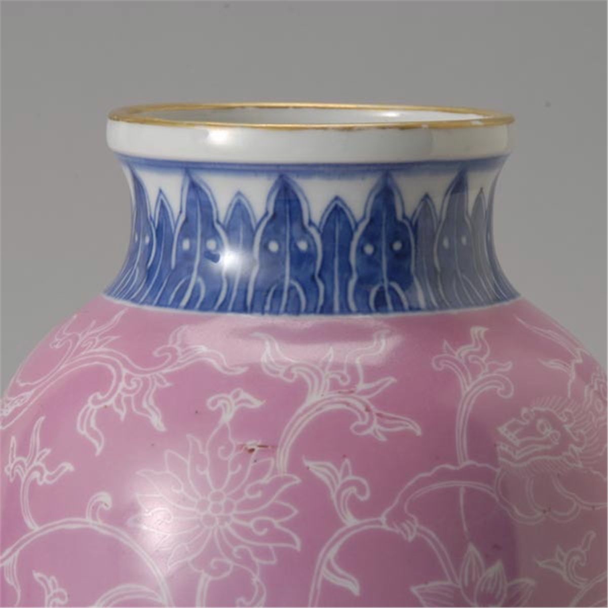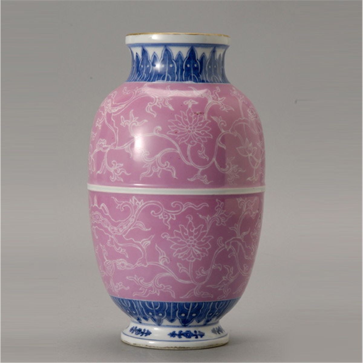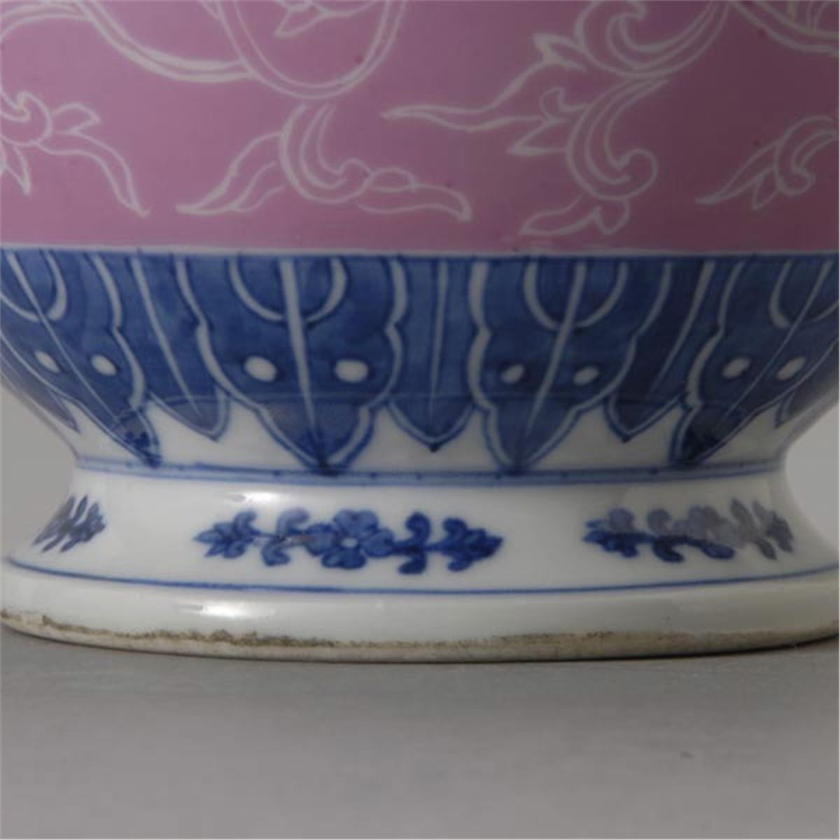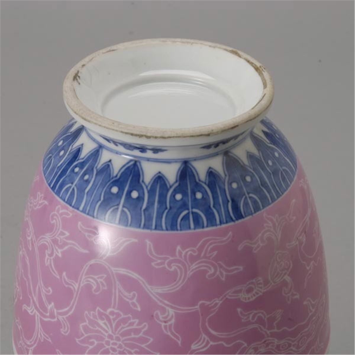 An Underglazed Blue and Enamel-Decorated Oval Porcelain Vase, Painted in underglaze blue and white to the neck and foot bands with the plantain leaf pattern, the body covered with pink enamel incised with dragons and phoenixes amid scrolling flowers, the mouth rim painted with gilt. Late Qing/Republic Period, Height: 9 1/4 inches (23.5 cm)