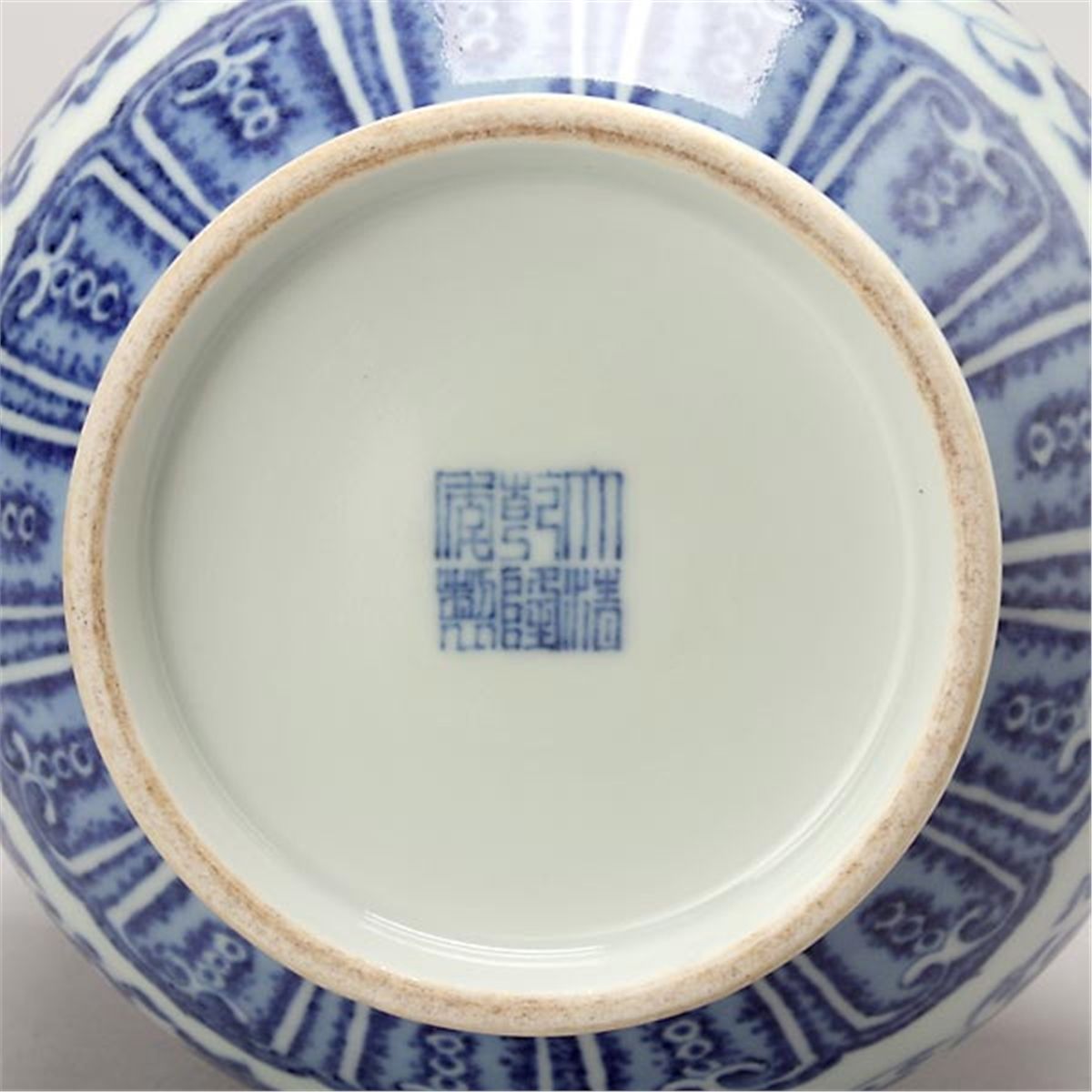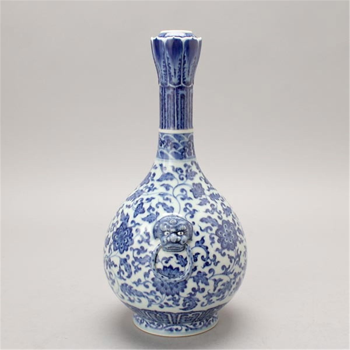 A Blue and White Lotus Head Porcelain Vase, the body decorated with a continuous meander of tendrils issuing large lotus-heads and with a pair of lion-head handles, below a band of waves and a lotus-form mouth, a Qianlong mark to the base {Height: 13 1/4 inches (33.6 cm)}