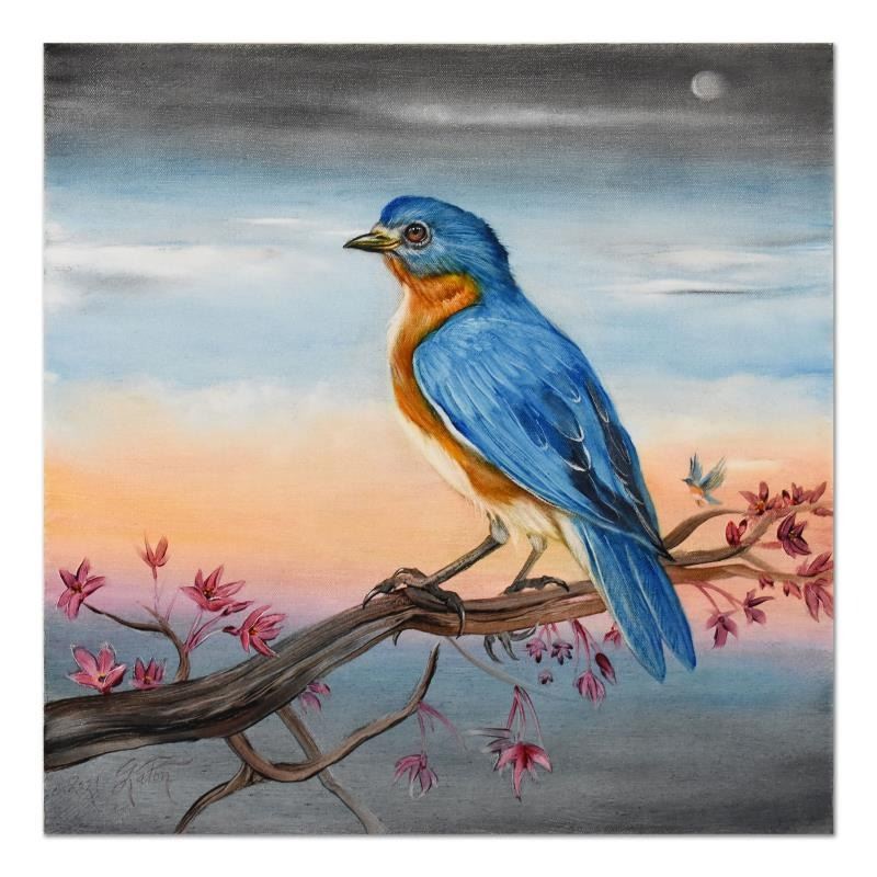 "A Bluebird in Your Yard" is an original oil painting on stretched canvas by Martin Katon, hand signed by the artist. Includes Letter of Authenticity. Measures approx. 20" x 20" (image).