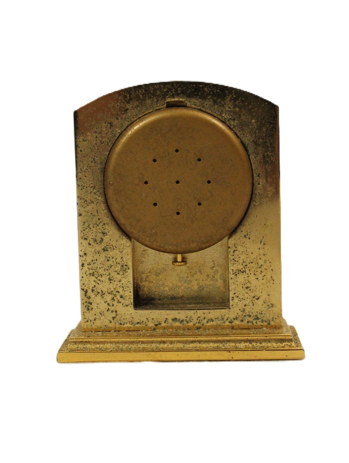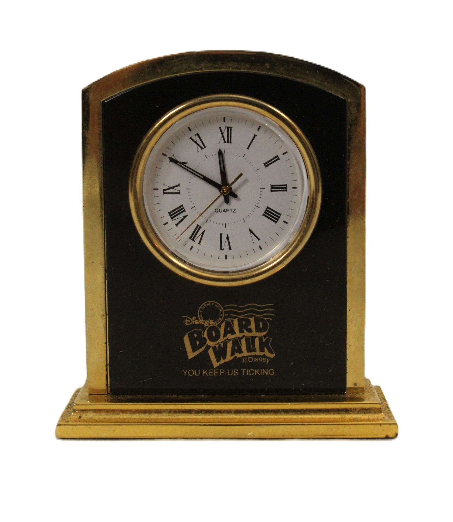 (Walt Disney World, 1992) This beautiful desk clock has a sleek look wth its black tablet, bold white face and gold surround and base. It measures 2.75" tall. It does have pitting in the metal on the back and sides.