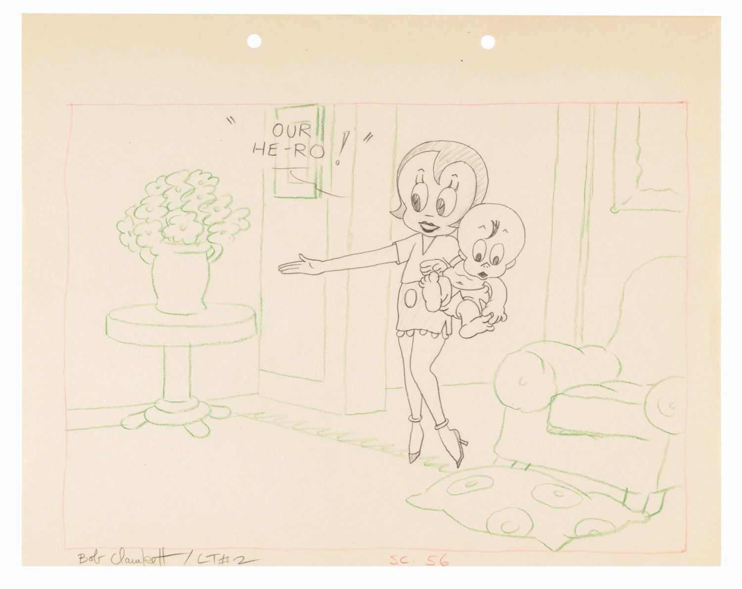 (Schlesinger, 1933) A layout drawing of Cookie and her baby brother Elmer from “Buddy’s Day Out.” This graphite and colored pencil drawing by Bob Clampett is from a deleted scene and features Clampett’s signature at the bottom left corner. With an image size of 7.75” x 10.75” on a 9.5” x 12” animation paper, the drawing is in fine condition with light discoloration from age.