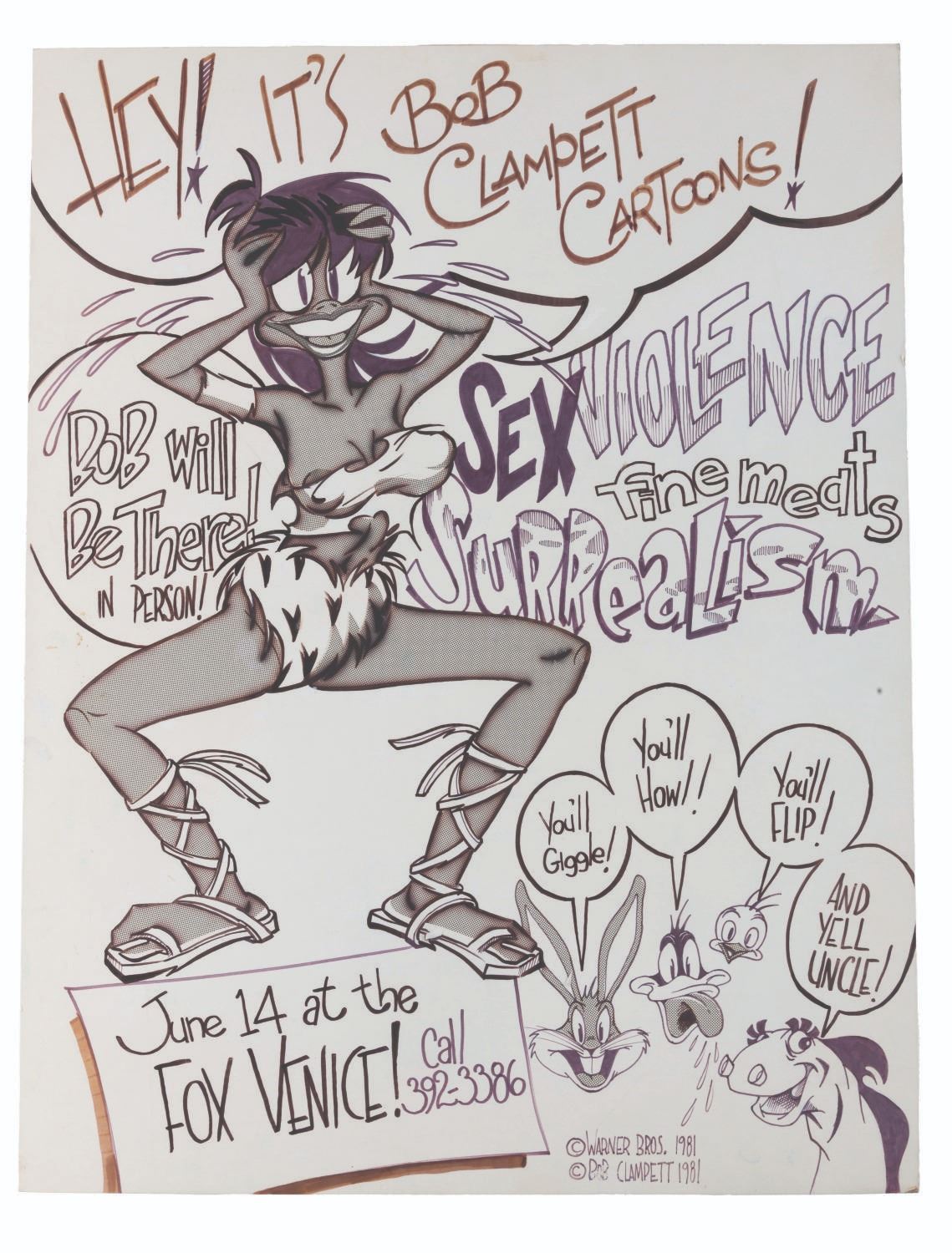 (Clampett, 1981) The event poster artwork by "The Ren & Stimpy Show" creator John Kricfalusi for Bob Clampett's art exhibition, held at the Fox Venice Theater in Los Angeles. The piece features many of Clampett’s most famous characters and a scantily-clad woman, promoting “sex, violence, fine meats” and “surrealism.” Kricfalusi, a longtime Clampett admirer, would end up developing "The New Adventures of Beany & Cecil" per the Clampett family's request. Accomplished in colored markers and Zipatone on 17” x 22” artist’s board, the art is in good condition with light spotting, stains, scrapes, edge wear, and discoloration from age.