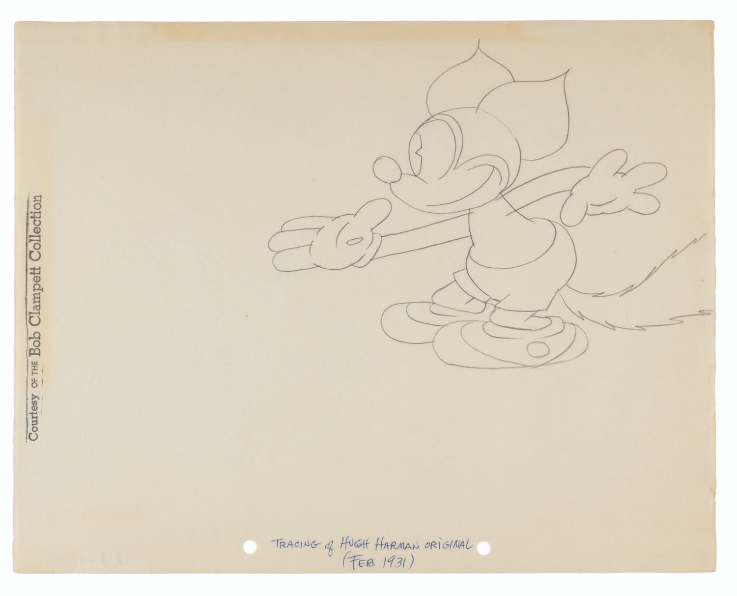 (Harman-Ising, 1931) A “Lady, Play Your Mandolin” Foxy drawing by Bob Clampett. This is a February 1931 tracing by Bob Clampett of original art by Hugh Harman. With a character image of 5.75” x 7.75” on 9.5” x 12” animation paper, stamped “Courtesy of the Bob Clampett Collection,” the graphite drawing is in very good condition with light creases and discoloration from age.
