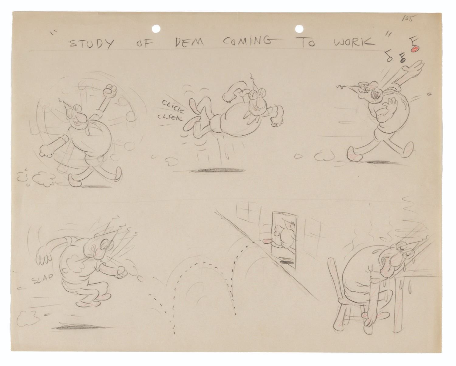(Clampett, 1930s) A gag drawing by Bob Clampett, inscribed “Study of Dem Coming to Work” accomplished in graphite and colored pencil. “Dem” refers to Nelson Demorest also called “Dem Dawg” around the studio. An animator, he had a very unusual appearance and funny personality. He was often caricatured with a pointed head. The piece features Clampett’s interpretation of a goon from E. C. Segar’s Popeye comic series. Ironically, Demorest left Warners to work for Fleischer Studios in Florida. With an image size of 8.5” x 11.75” on 9.5” x 12” animation paper, the drawing is in very good condition with light creases.