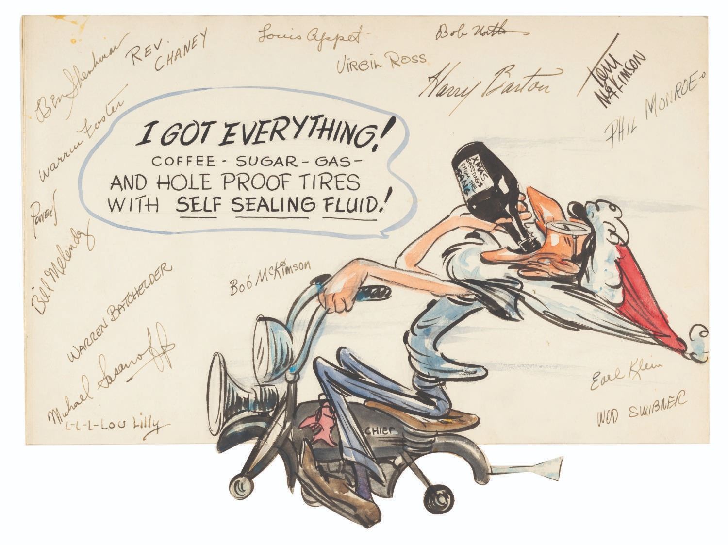 (Schlesinger, 1940s) A hand-painted Christmas card to Bob Clampett of him riding a motorcycle, signed by 17 of his colleagues at Leon Schlesinger Productions. Signatures include Bill Melendez, who later produced Peanuts animated specials for television, Virgil Ross, and brothers Tom and Bob McKimson. Measuring 9” x 11.25”, the card accomplished in ink and watercolor is in very good condition, with light handling wear, age wear, and a small stain by the top left corner.