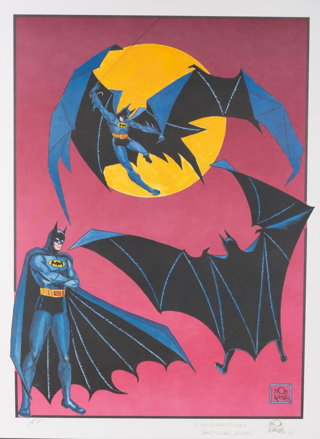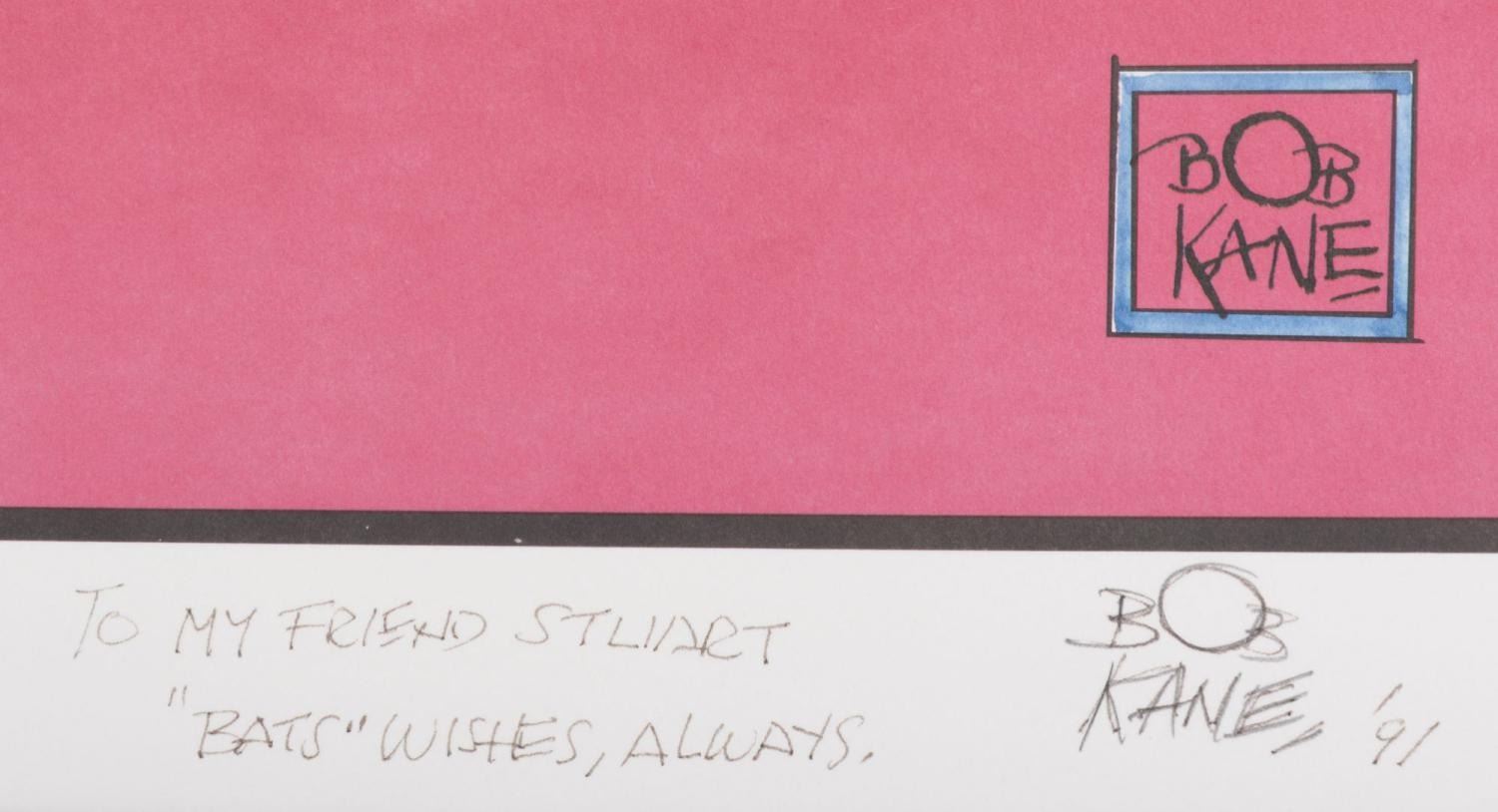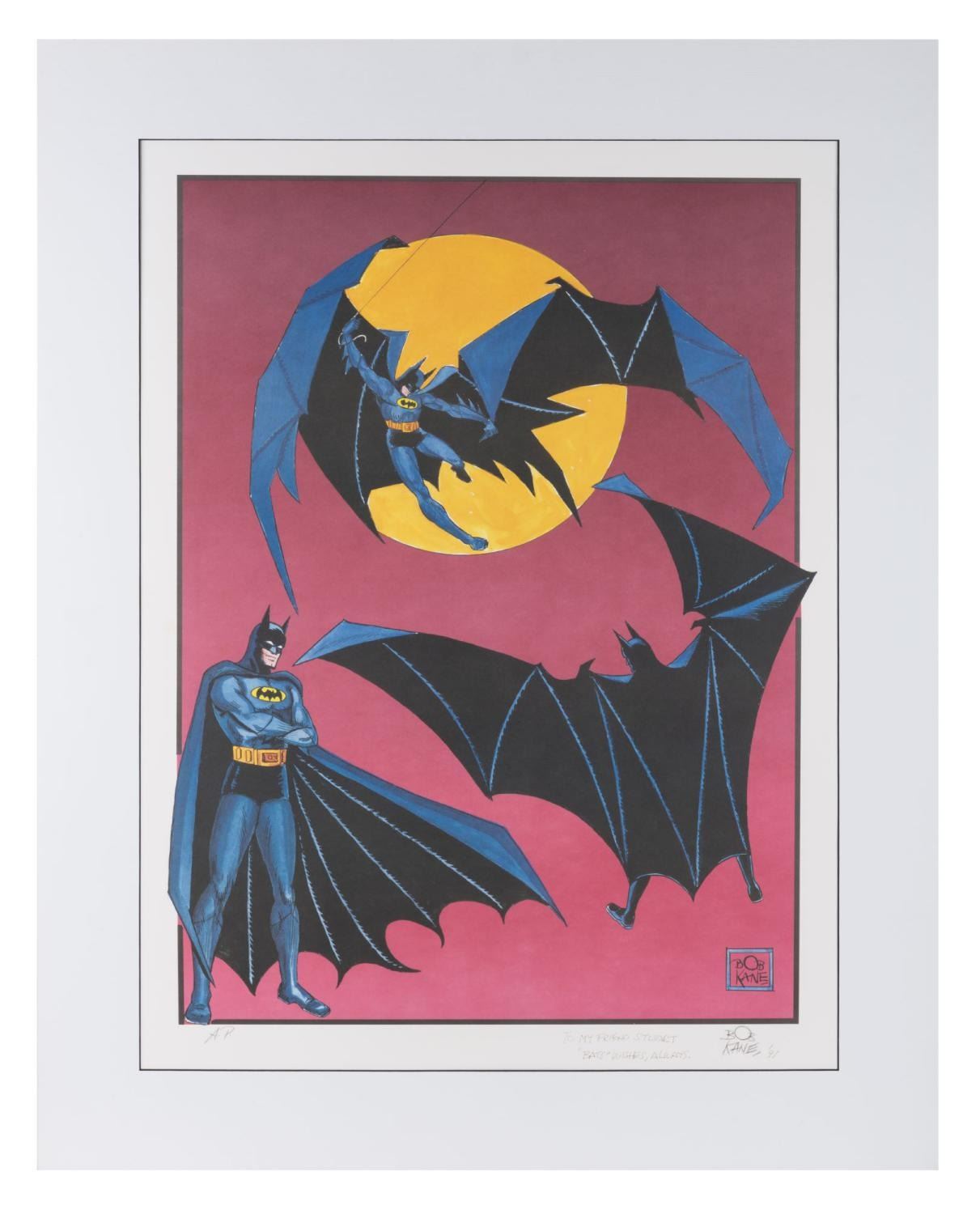 (Warner Bros., 1991) A Batman artist proof lithograph, signed in graphite with dedication by the character’s co-creator, Bob Kane. Kane was known to have used multiple ghost artists throughout his career and this artwork is attributed to Greg Theakston, Kane’s final ghost artist who had in turn appropriated the images from Todd McFarlane’s “Batman: Year Two.” The lithograph measures 20” x 27.5” and is matted to a full size of 26” x 33.25”. The artwork is in fine condition.