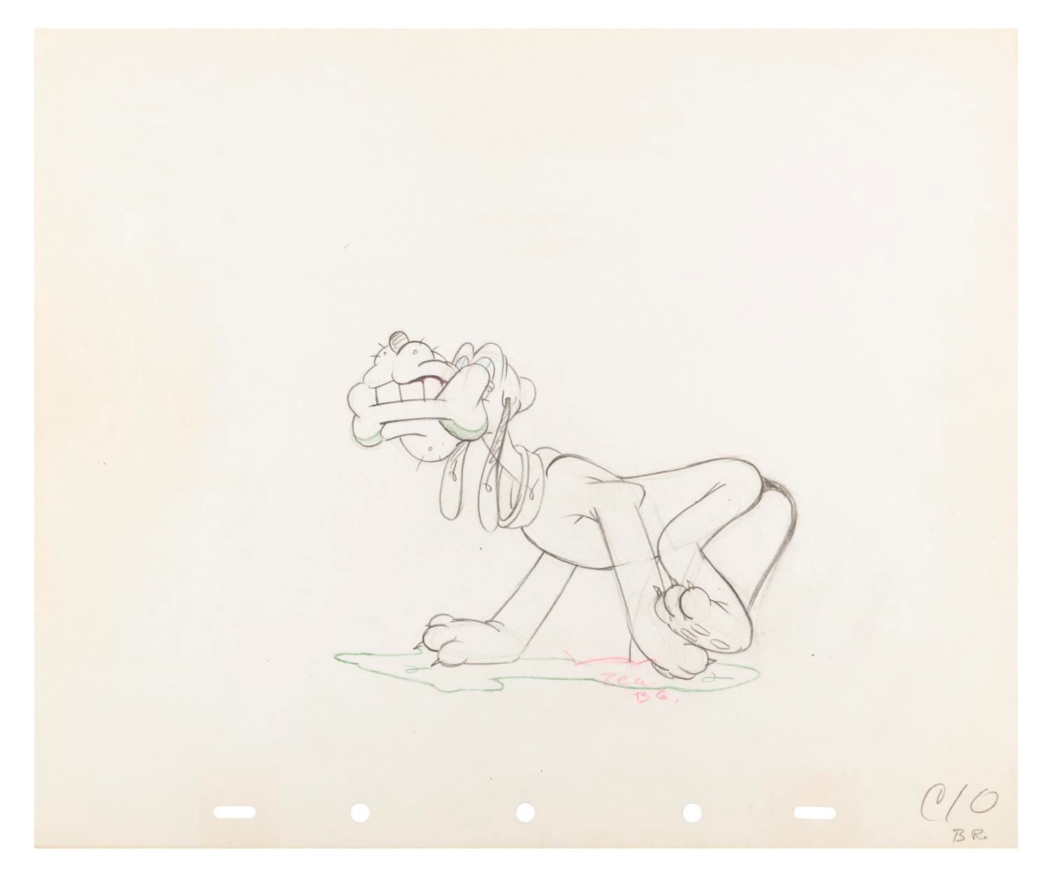 (Disney, 1940) An original production drawing of Pluto from the animated short “Bone Trouble.” With an image size of 5.75” x 4.25” on 10” x 12” animation paper, the drawing is in good condition with handling wear, light discoloration from age, and a 4” fine crease to the left that does not affect the image.