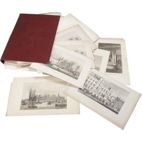 <B>A Book Containing Prints of British Monuments<BR></B></I> <BR>A hardcover book containing approximately 165 loose prints, all depicting various British monuments and landmarks. Some repetitious prints. Examples include: <I>Kensington Palace</B></I>, <I>Ironmongers Hall</B></I>, <I>Entrance to the King's Palace</B></I>, <I>House of Lords</B></I>, <I>Horse Guards</B></I>. Spine of book labeled <I>H.O./K</B></I>.<BR> <B>Condition Report:</B> Heavy surface dirt, staining, discoloration and foxing, worn edges.<BR><BR><b>Shipping:</b> Books & Catalogs (<a target="_blank" href="http://www.heritageauctions.com/common/shipping.php">view shipping information</a>)
