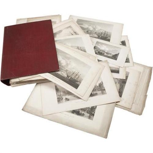 <B>A Book Containing Prints of British Monuments<BR></B></I> <BR>A hardcover book containing approximately 180 loose prints, all depicting various British monuments and landmarks. Some repetitious prints. Examples include: <I>West India Docks</B></I>, <I>Westminster Abbey</B></I>, <I>Westminster Bridge</B></I>, <I>The Treasury Whitehall</B></I>. Spine of book labeled <I>W.E</B></I>.<BR> <B>Condition Report:</B> Heavy surface dirt, staining, discoloration and foxing, worn edges.<BR><BR><b>Shipping:</b> Books & Catalogs (<a target="_blank" href="http://www.heritageauctions.com/common/shipping.php">view shipping information</a>)