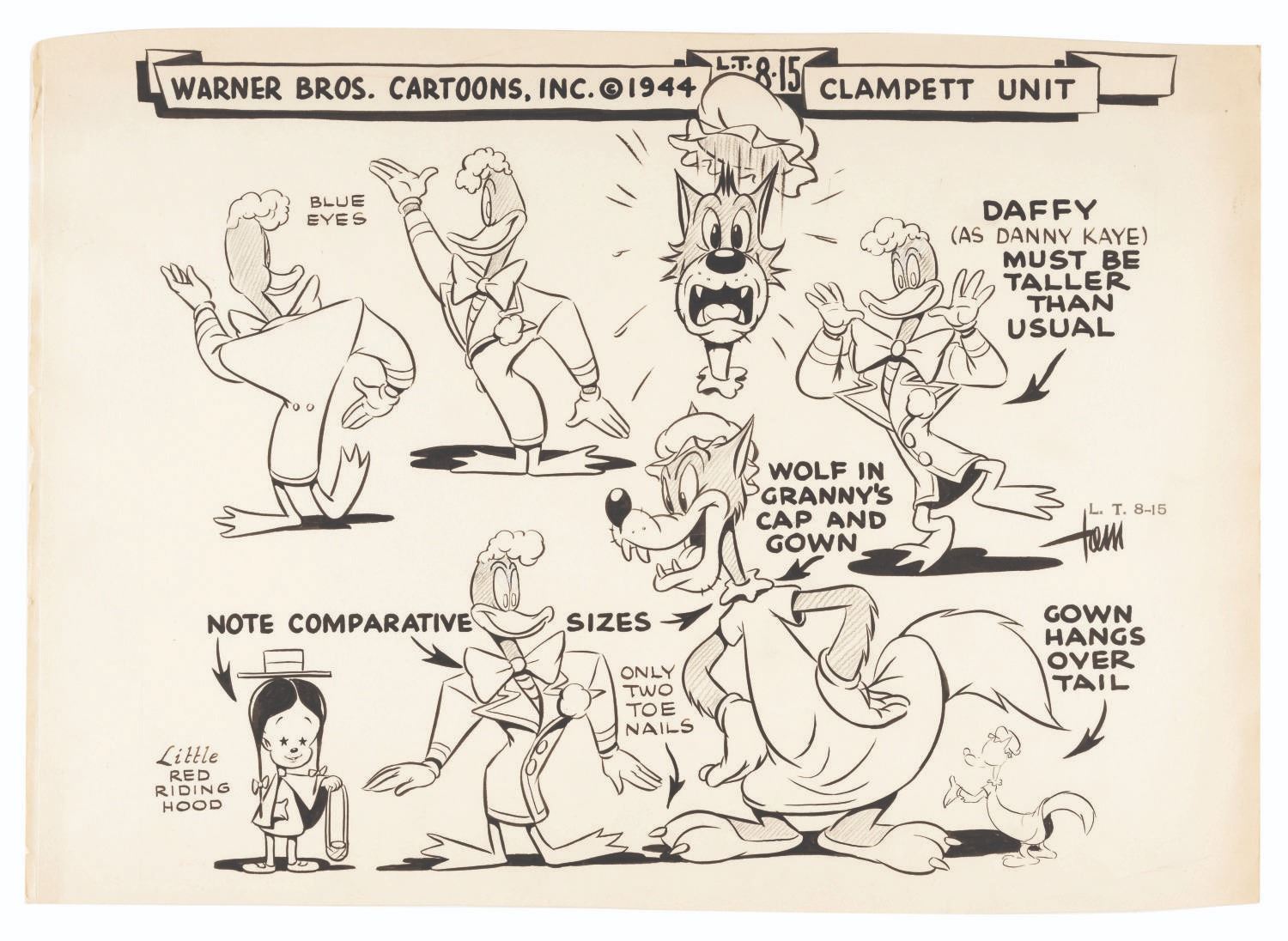 (Warner Bros., 1946) An original model sheet clean-up drawing from the Looney Tunes short “Book Revue” of Daffy Duck, Little Red Riding Hood, and The Big Bad Wolf. Traced and inked from Tom McKimson’s original drawing, this sheet was used to make photostat copies and distributed to animators working on the production. Measuring 11” x 15.5”, the model sheet is in good production-used condition with edge wear and creases from production use, and light discoloration from age.