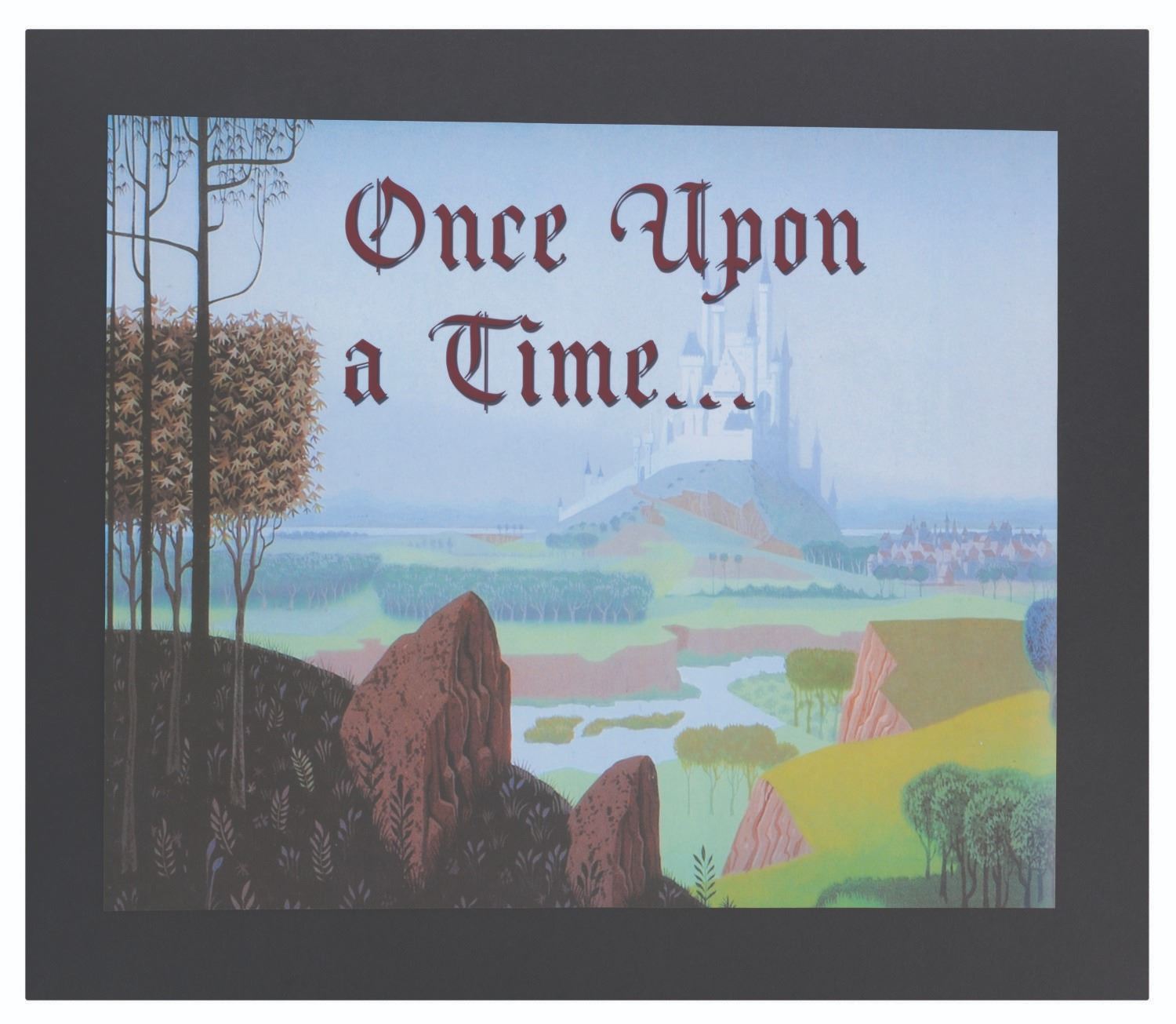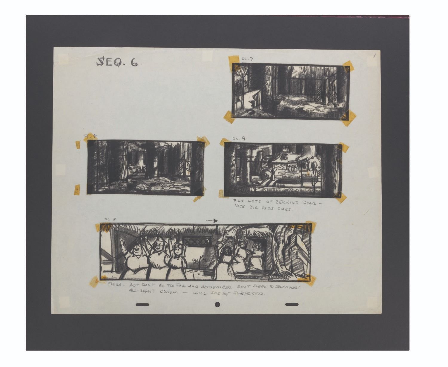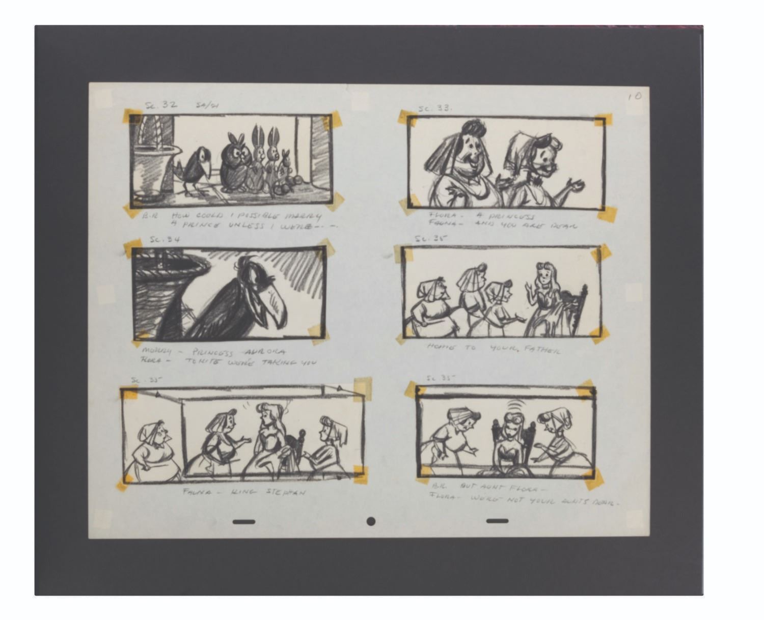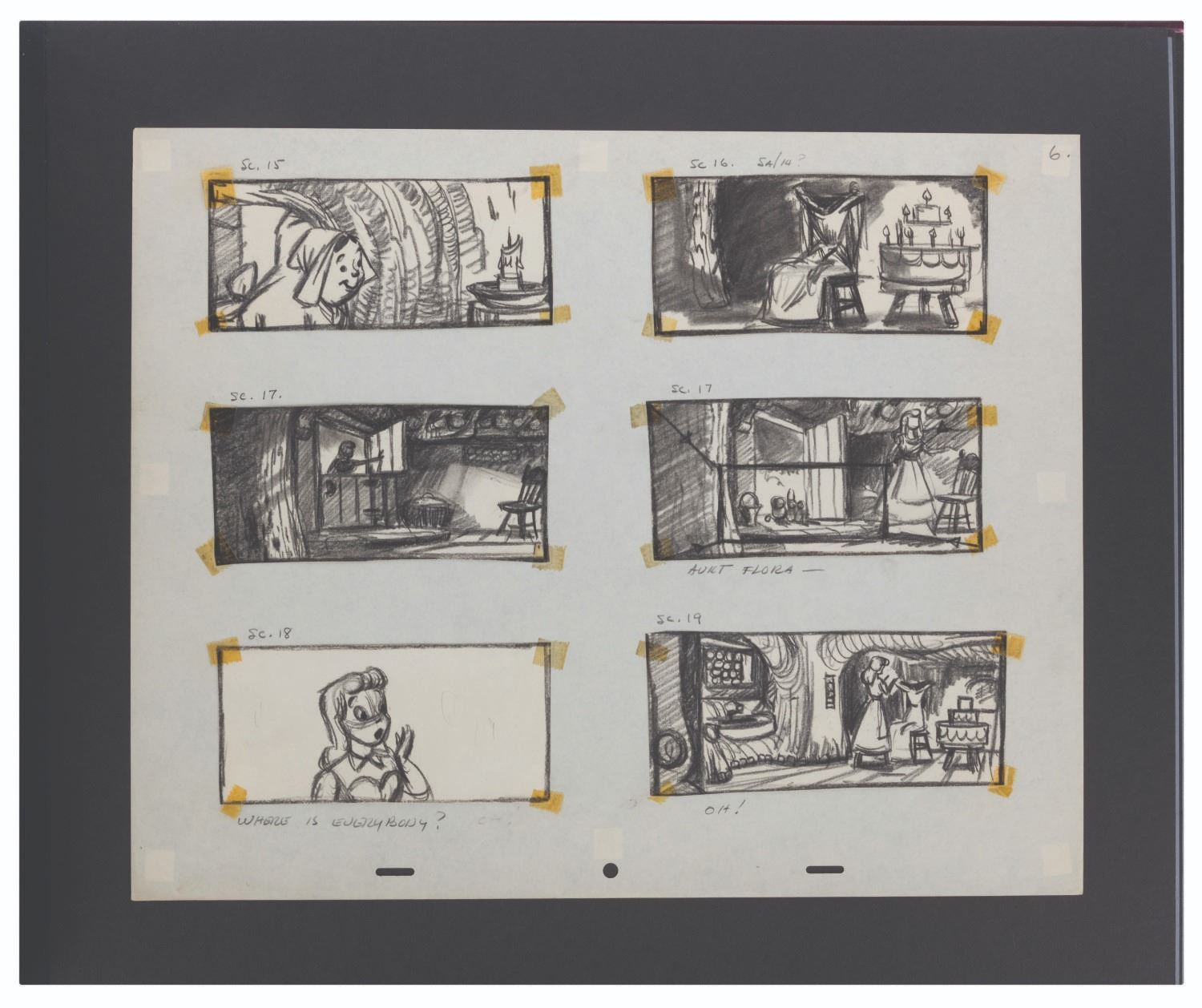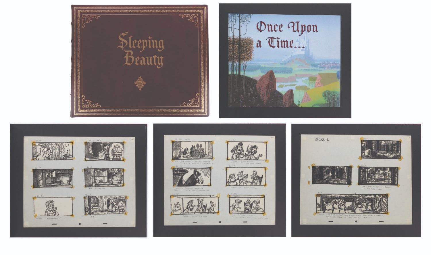 (Disney, 1959) A unique leatherbound book of storyboards from Walt Disney’s “Sleeping Beauty.” These original storyboards from early in production were drawn by Disney artist Joe Rinaldi for the scenes of Briar Rose with Flora, Fauna, and Merryweather in the forest cabin with Diablo the raven discovering them. A total of 22 original hand-drawn panels are affixed to four 12.5” x 15.5” animation paper pages, themselves presented within the 16.5” x 20.25” leather-bound book with a gold-embossed “Sleeping Beauty” title and filigrees. The fairy tale storybook presentation is further enhanced with a “Once Upon A Time” page with a color copy image from the film’s distinctive backgrounds, and elaborate endpapers. The panels measure from 1.5” x 3” to 2.75” x 6.75” and are in good condition with wear from production use and age. The 12.5” x 15.5” storyboard pages are in very good condition with light wear from handling and discoloration from age. The 16.5” x 20.25” book is in very good condition, with light scratches and creases from handling.