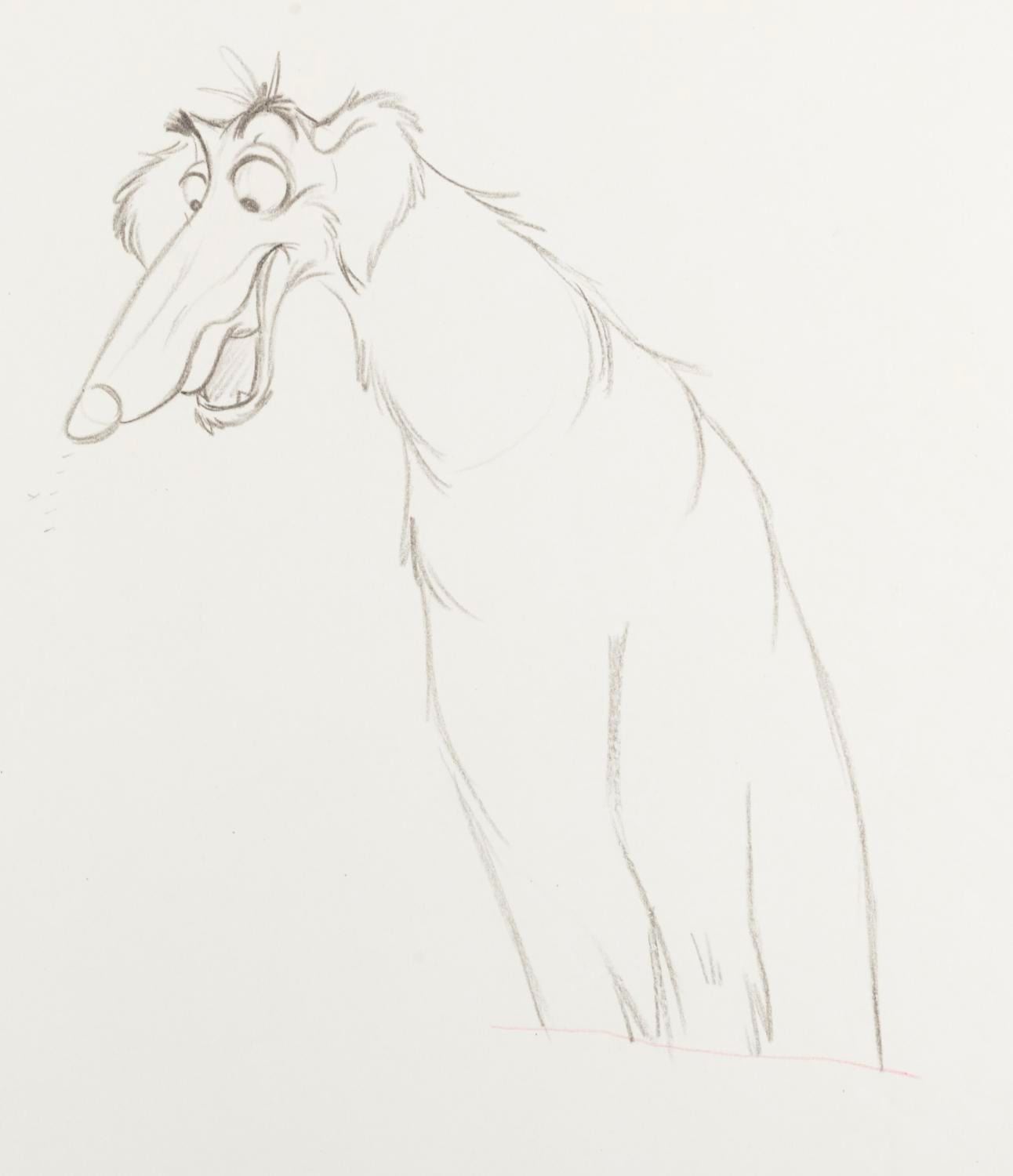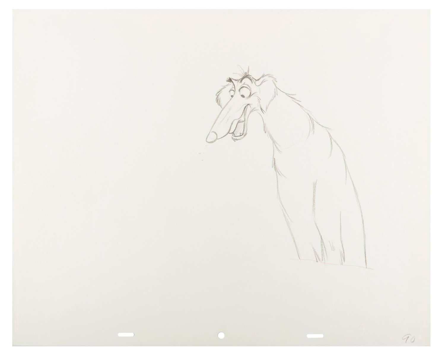 (Disney, 1955) An original production drawing in pencil of Boris from the pound scene of “Lady and the Tramp.” With an image size of 5.5” x 7.5” on 12.5” x 15.5” animation paper, the drawing is in very good production-used condition with light wear and typical color shift to the paper from age.