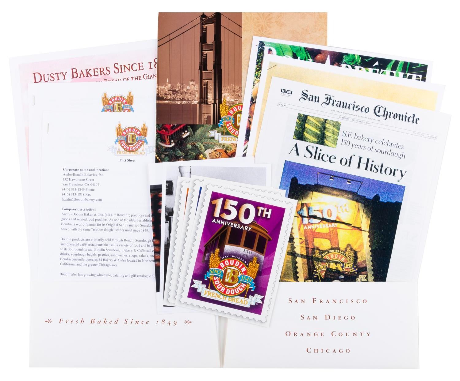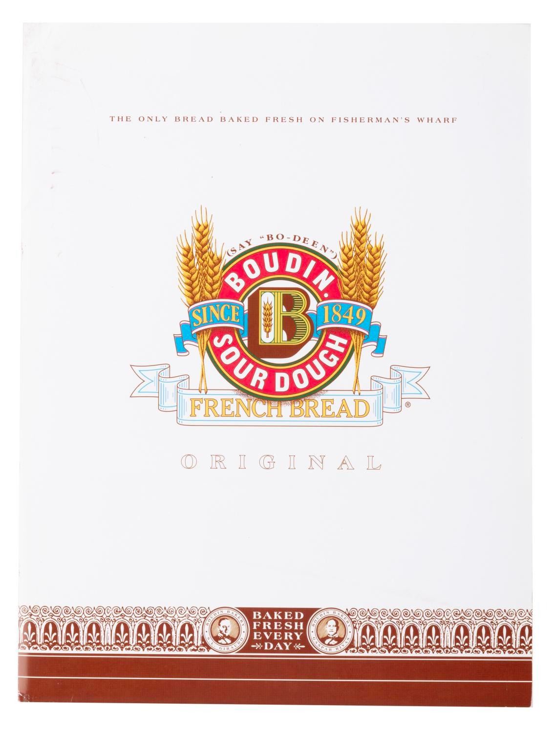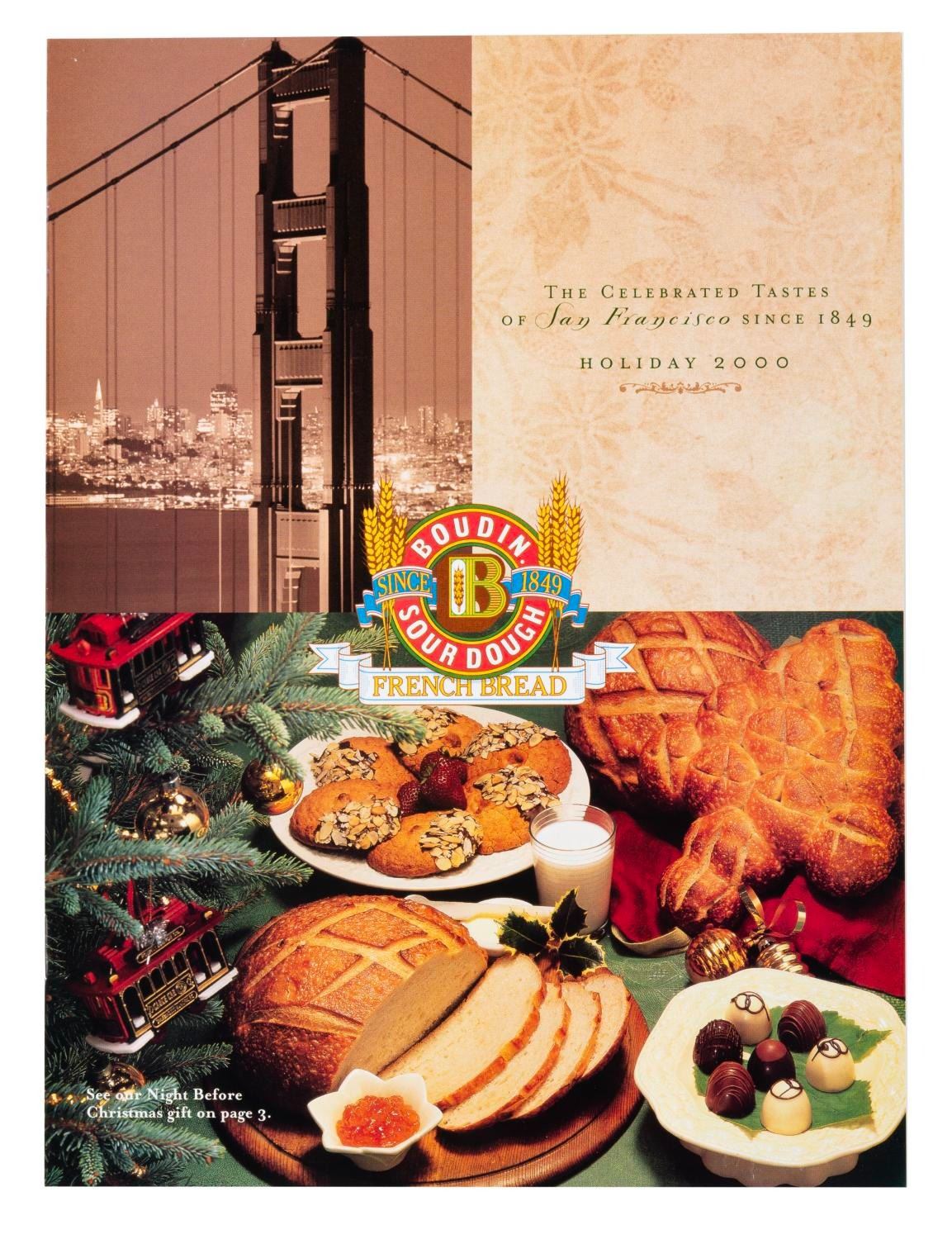 (Boudin, 2000) A press kit for Boudin sourdough bread. This kit dates to the early 2000s, with information on their 150th anniversary in 1999, but does not include material on their restaurant and attraction at Disney’s California Adventure. Inside are a fact sheet, copies of articles about Boudin, and a Holiday 2000 catalog. The press kit is in very good condition with light handling wear.