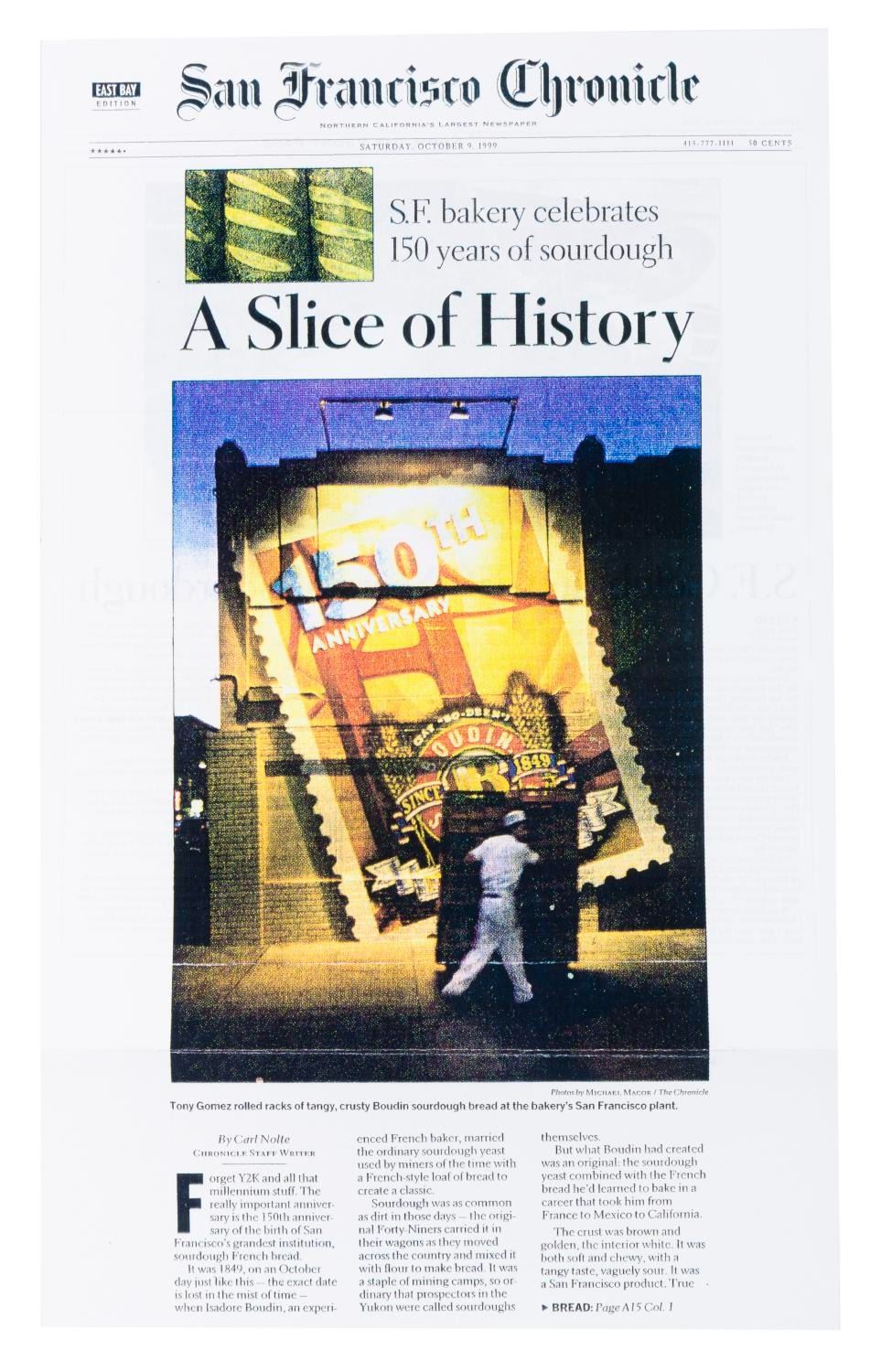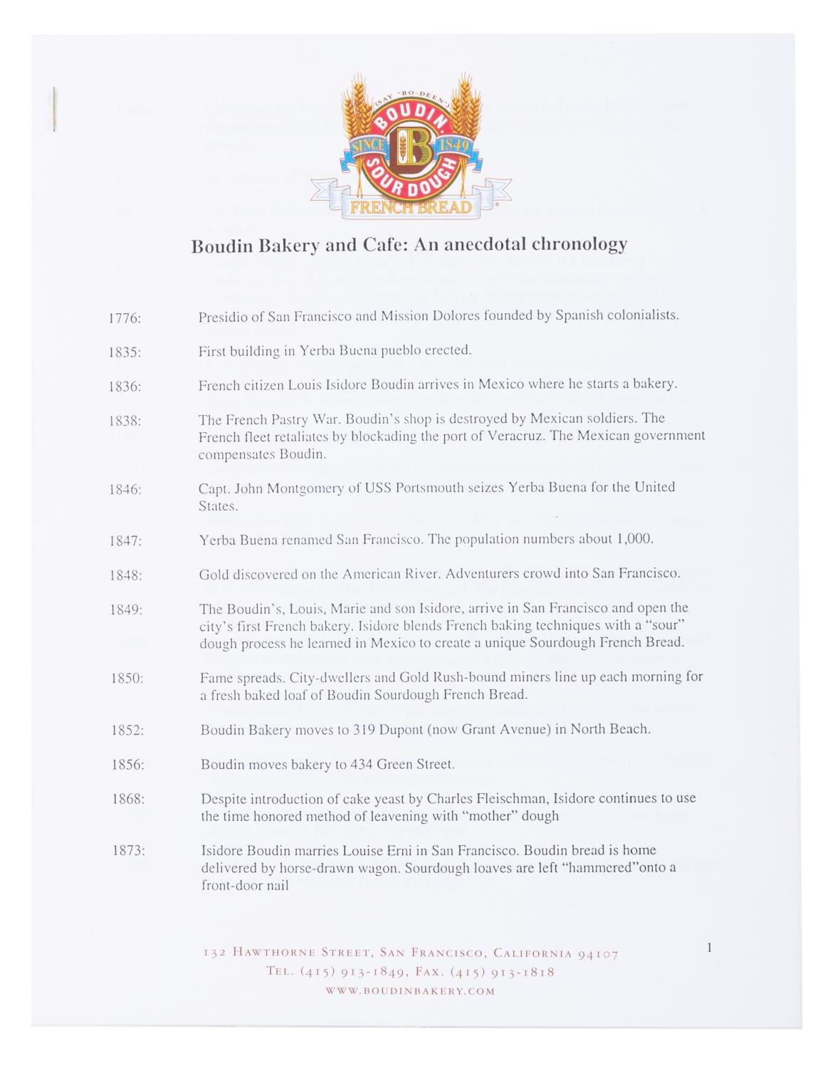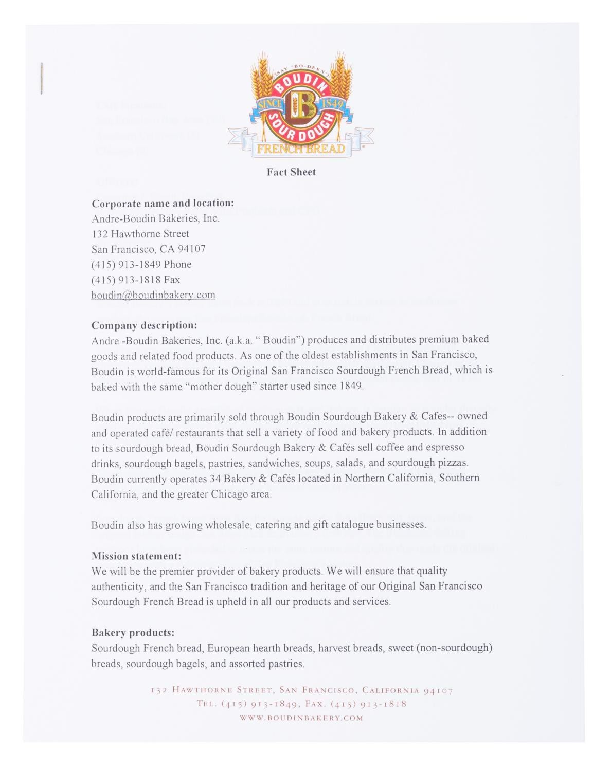 (Boudin, 2000) A press kit for Boudin sourdough bread. This kit dates to the early 2000s, with information on their 150th anniversary in 1999, but does not include material on their restaurant and attraction at Disney’s California Adventure. Inside are a fact sheet, copies of articles about Boudin, and a Holiday 2000 catalog. The press kit is in very good condition with light handling wear.
