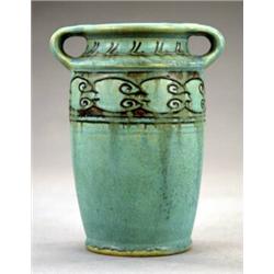 A Bourne Denby cylindrical vase, - A Bourne Denby cylindrical vase, with small loop handles, dec...