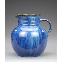 A Bourne Denby large globular jug, with deep ribbed collar and ribbed loop handle, decorated with an electric blue glaze, 9in high, printed marks