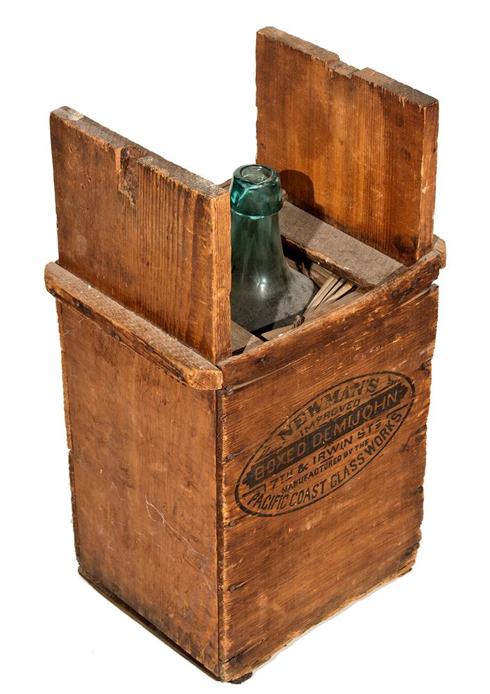 c1880 This is a three gallon demijohn manufactured by the Pacific Coast Glassworks of San Francisco. The stencil on the surrounding wood box reads “Newman’s Improved Boxed Demijohn, 7th and Irwin St” The box is also marked “Net Contents 3 Gallons, Diamond Dry Gin.” The wicker wrap is still in place and the box signage is pretty sharp for its age. This is a great curiosity for any bottle collection. - HKA#64870