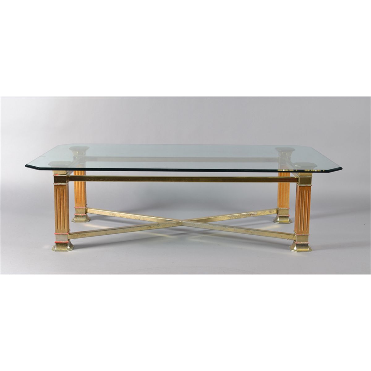 With beveled glass top and x form stretcher, very well made. Circa 1980's. 55" W x 16" H x 32" D. Excellent condition. Private collection Gross Pointe, MI.