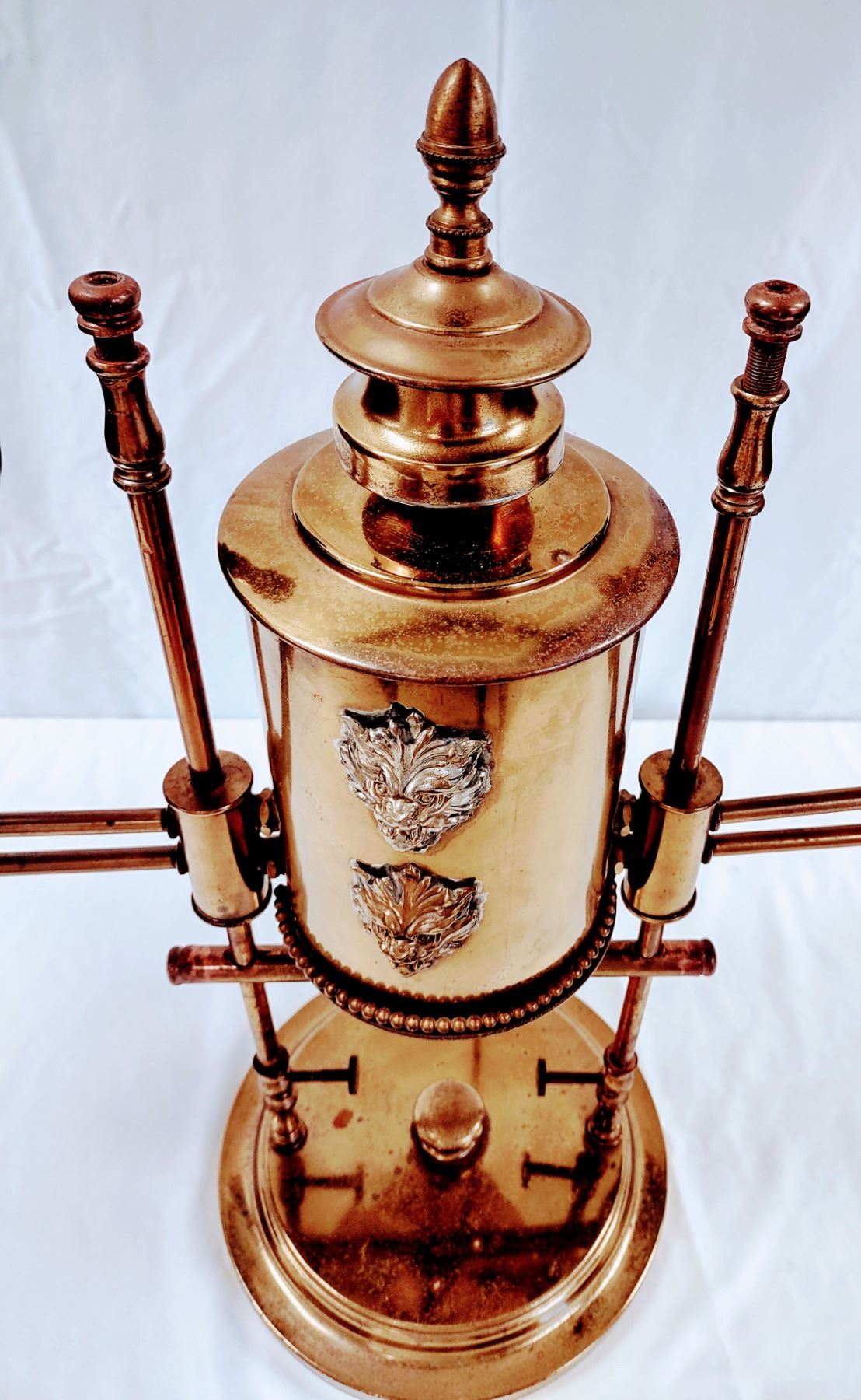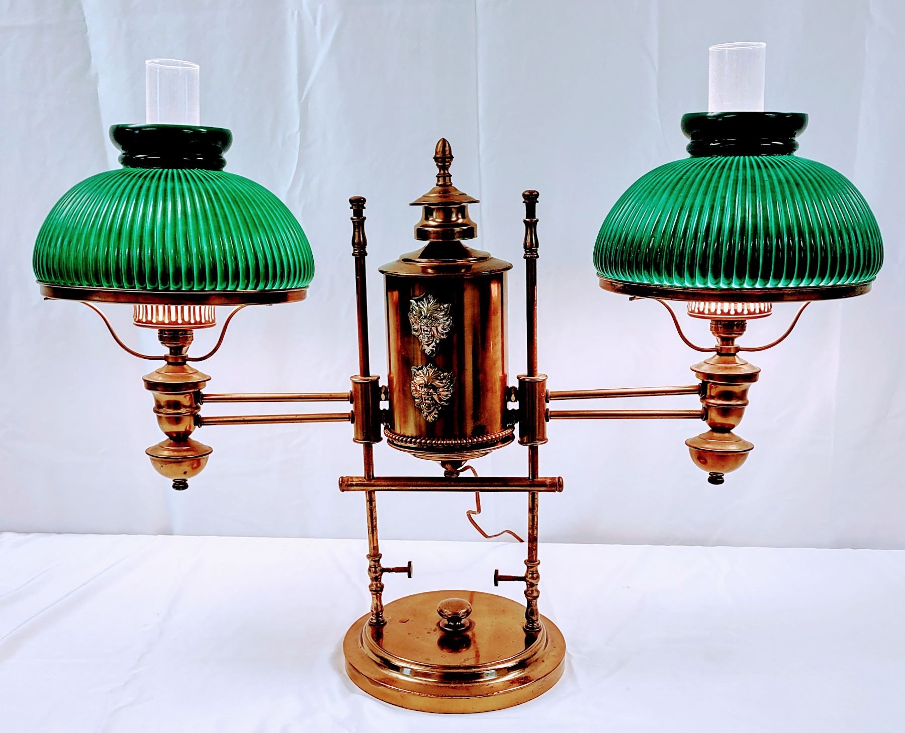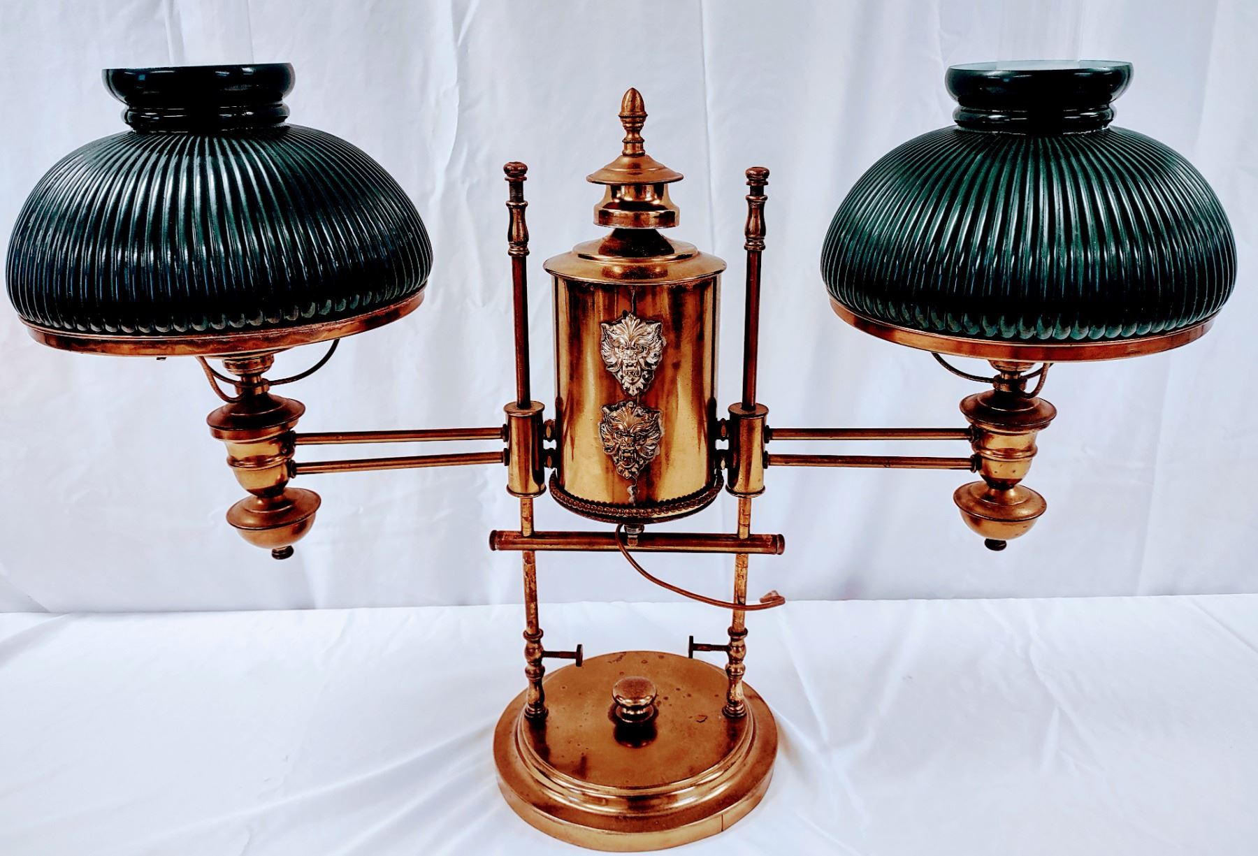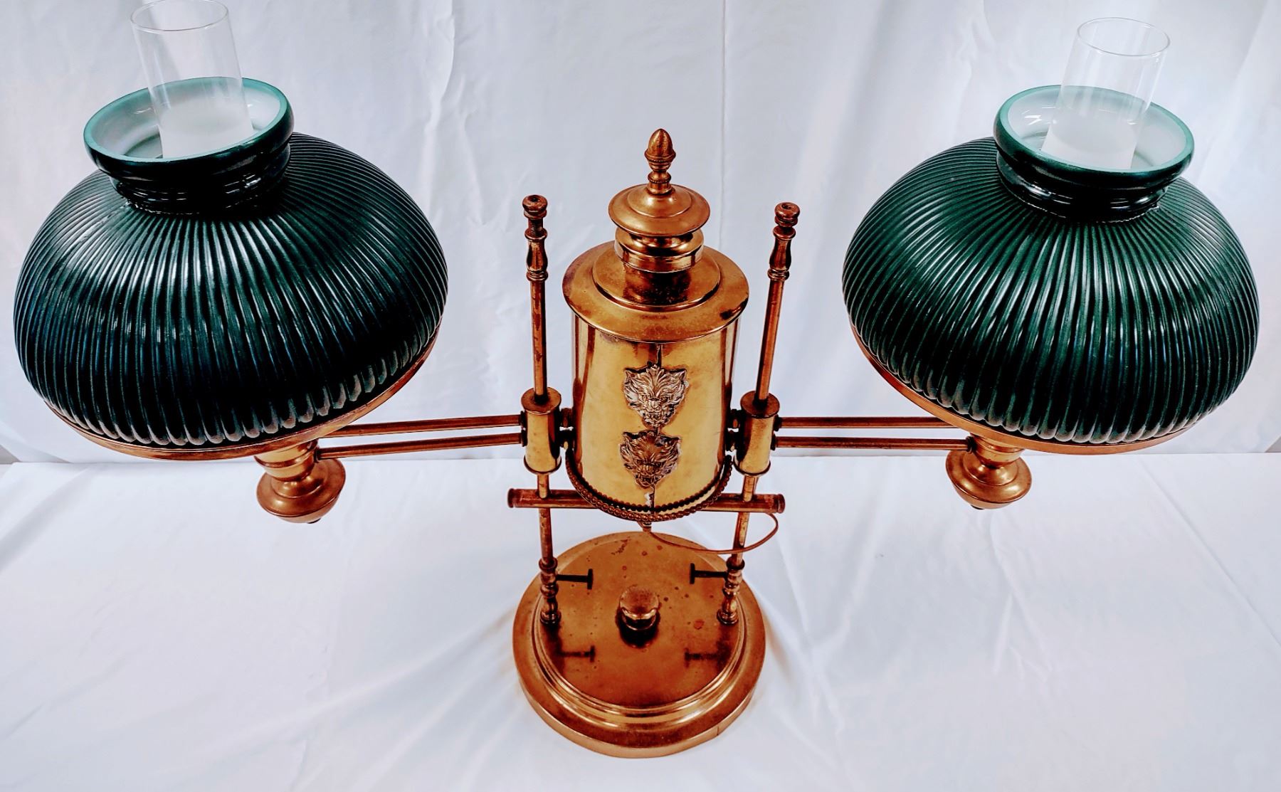 A Brass Student Double Glass Shade Lamp. This lamp is adorned with (4) Lions Faces which is rare. *The Student Lamp was a lamp popular in the late 1800s in both single and double burner models. Its claim to fame was that it cast little to no "undershadow." It was mounted on a vertical post and the lamp itself was on a swing arm. The oil font is to the side of the vertical post and the oil is siphoned to the lamp where it is burned. The Manhattan Student Lamp, manufactured by the Manhattan Brass Co., was one of the most popular and least expensive lamps in its day. It is easily found in various antique stores. Richard Miller and John Solverson point out in their book "Student Lamps of the Victorian ERA" these lamps were known in Europe as "Reading Lamps" and in England as the "Queen's Reading Lamp."The lamps were generally 7" and 10" and came in both single and double lamps. It was felt in those days that if you had two wicks in the burner you increased the amount of light and to some degree that apparently was true.