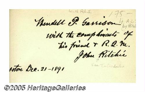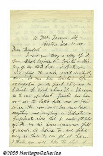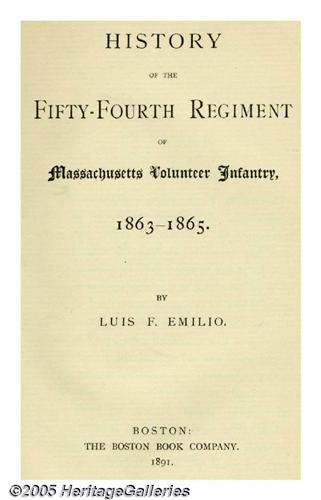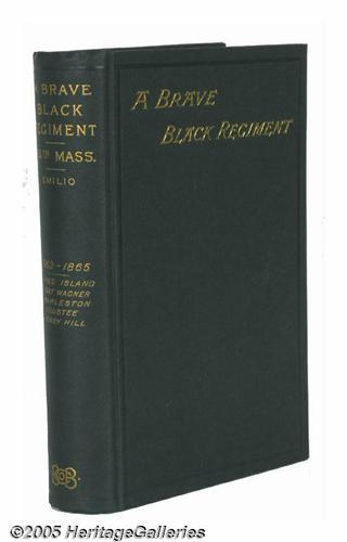 <B>"A Brave Black Regiment," First Edition, with Ritchie Autograph Letter Signed: History of the Fifty-fourth Regiment of Massachusetts Volunteer Infantry 1863-1865</B></I> By Luis F. Emilio. One of the rarest and most desirable of all Civil War histories, this book, <I>A Brave Black Regiment,</B></I> traces the story of this black regiment made famous in the 1989 film, <I>Glory.</B></I> The author, a captain in the regiment, used various sources for the book, but much came from the journal of their Regimental Quartermaster Lt. John Ritchie. It covers James Island, Fort Wagner, Charleston, Olustee and Honey Hill. This particular book is inscribed, signed and dated (1891) to Wendell Garrison by Ritchie. Also included in this lot is a two page ALS to Garrison regarding the book. I quote from this letter <I>"I think you will find the work most excellently done. It has been Emilio's life occupation for the past 25 years." "...has consulted everything and everybody on Federate and Confederate side that he could get hold of." "There is no spread-eagle, no laudation, no singling out of one over another, but an honest effort to tell all that is known about both officer and private in simple plain language." "It is a credit to Emilio, the Regiment, and to the Cause."</B></I> The 54th Massachusetts Infantry was organized in March 1863 by Robert Gould Shaw, the son of a prominent Boston abolitionist. It was made up primarily of free northern blacks including two sons of Frederick Douglass. Colonel Shaw (played by Matthew Broderick in the film) was killed at Battery Wagner in South Carolina as he shouted, <I>"Forward, Fifty-fourth!"</B></I> The 54th played an important role in the Union's efforts in the South and used a battle cry of <I>"Three cheers for Massachusetts and seven dollars a month,"</B></I> referring to the controversial difference in pay between black and white troops. The Regiment was mustered out in August of 1865. This book was published in Boston by the Boston Book Company in 1891; near-excellent condition; blue cloth with gilt title; 410 pages; illustrated; map included. You won't find a nicer copy with better association anywhere! Lot:251