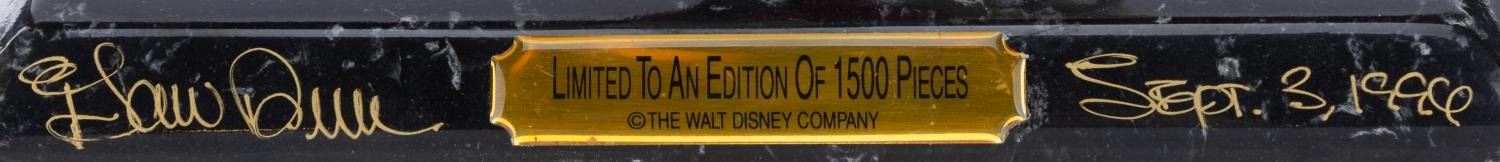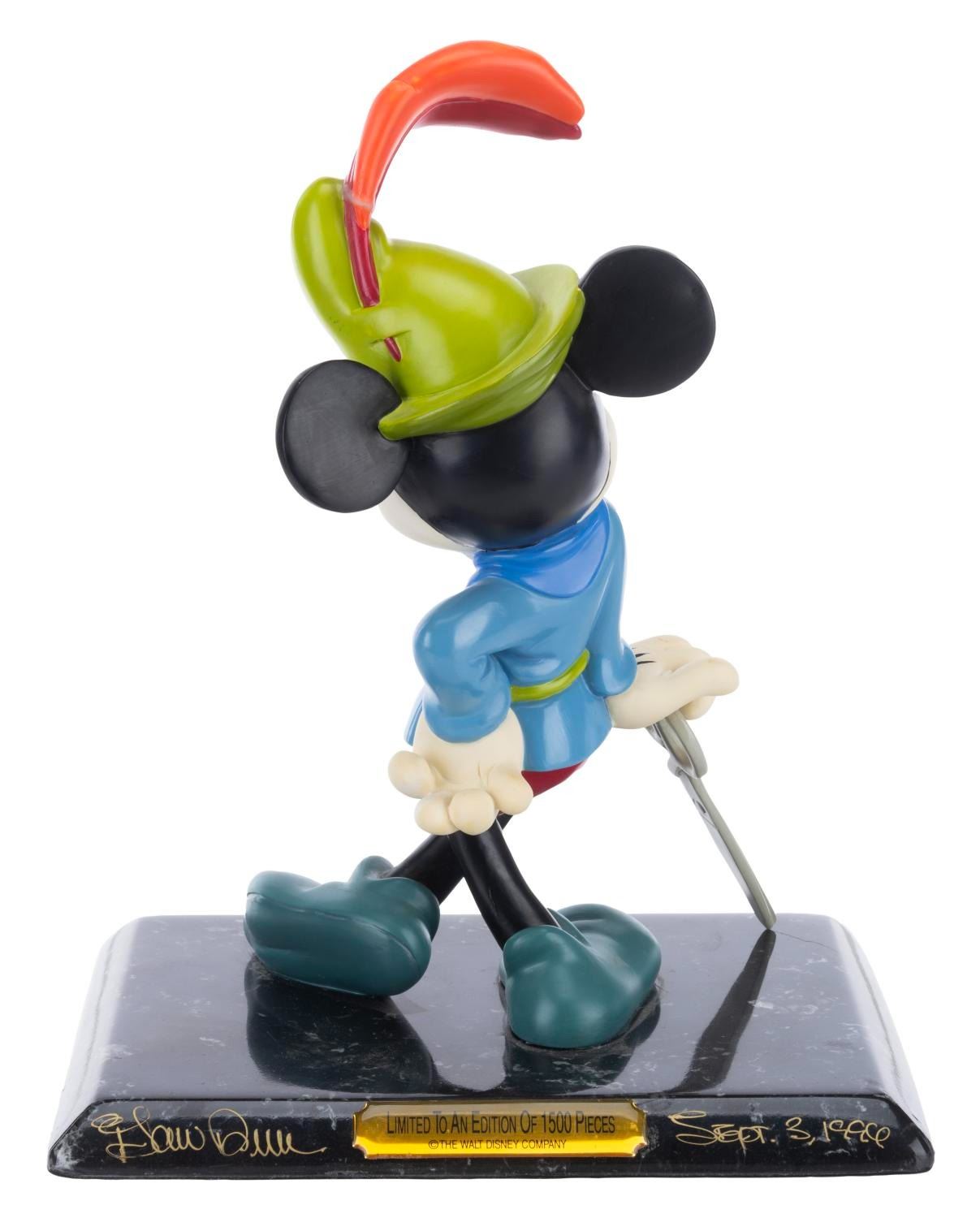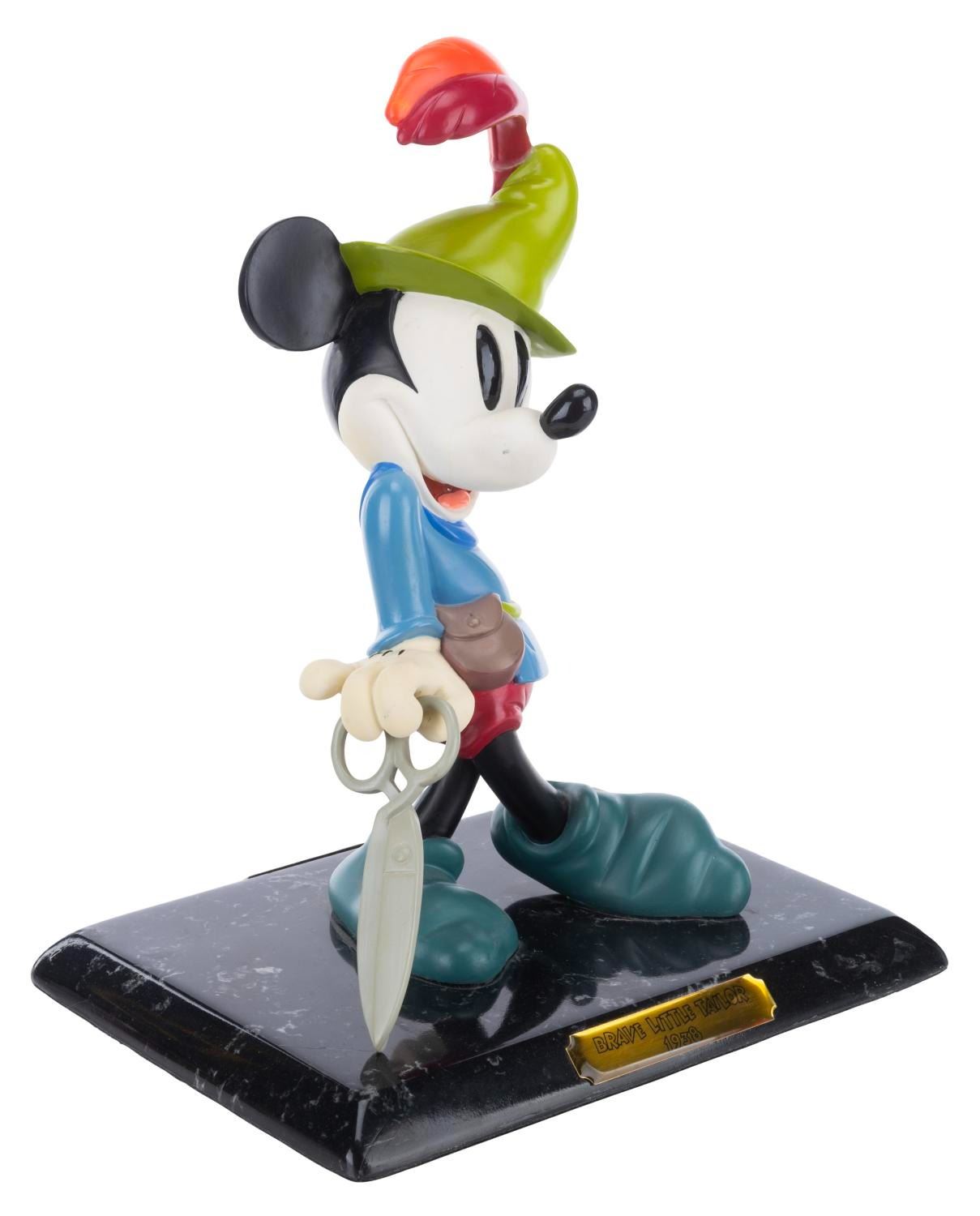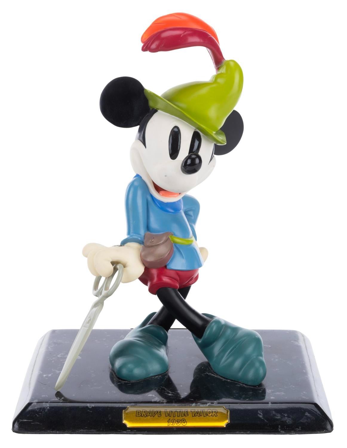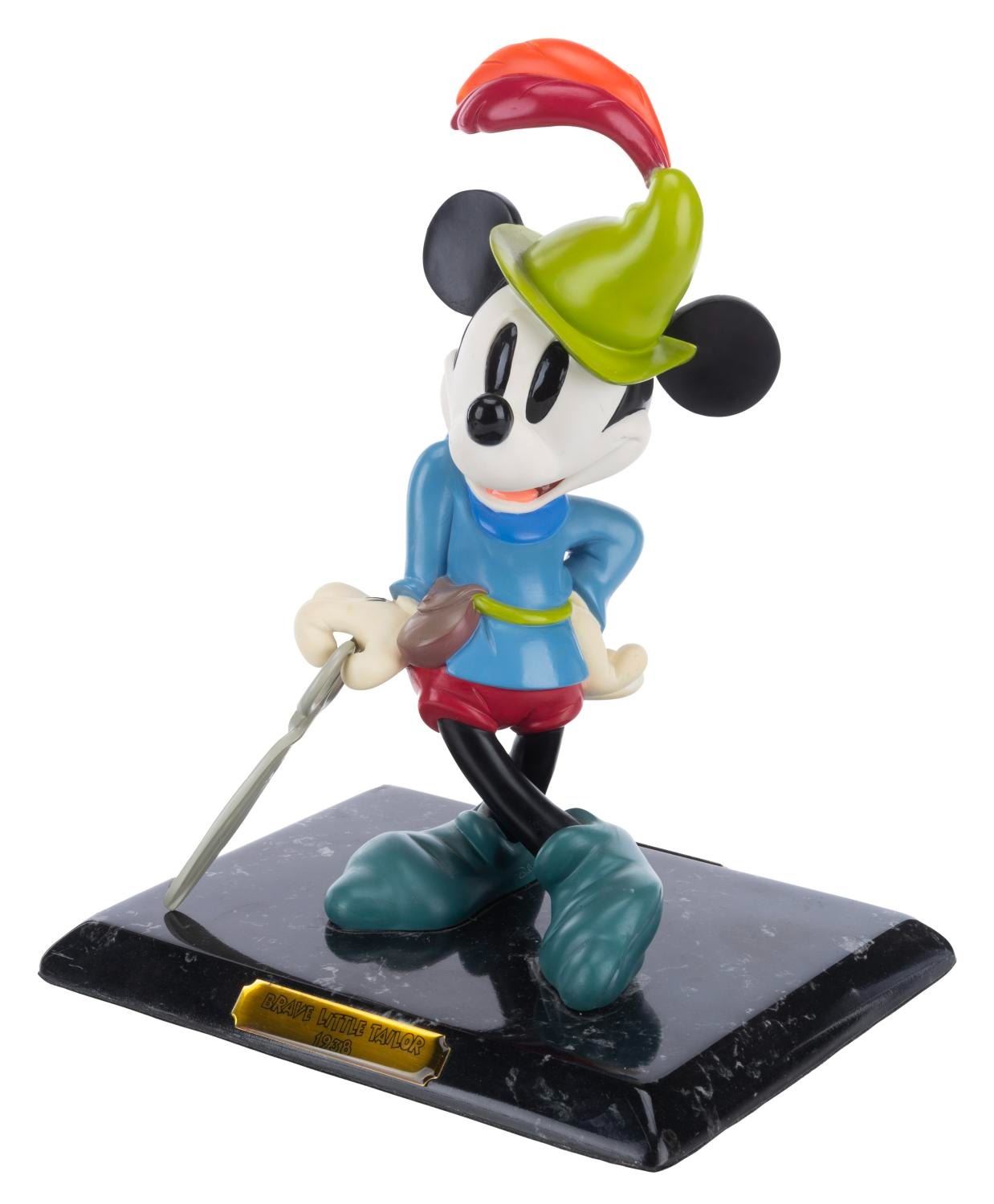 (Disneyana, 1996) A statue of Mickey Mouse as he appeared in "The Brave Little Tailor," produced for the 1996 Disneyana Convention in an edition of 1500 pieces and hand-signed and dated by designer Marc Delle. Measuring 9" x 6.5" x 11.5" tall, the resin statue displays in good condition with light scuffs, and a repair to the hat feather.