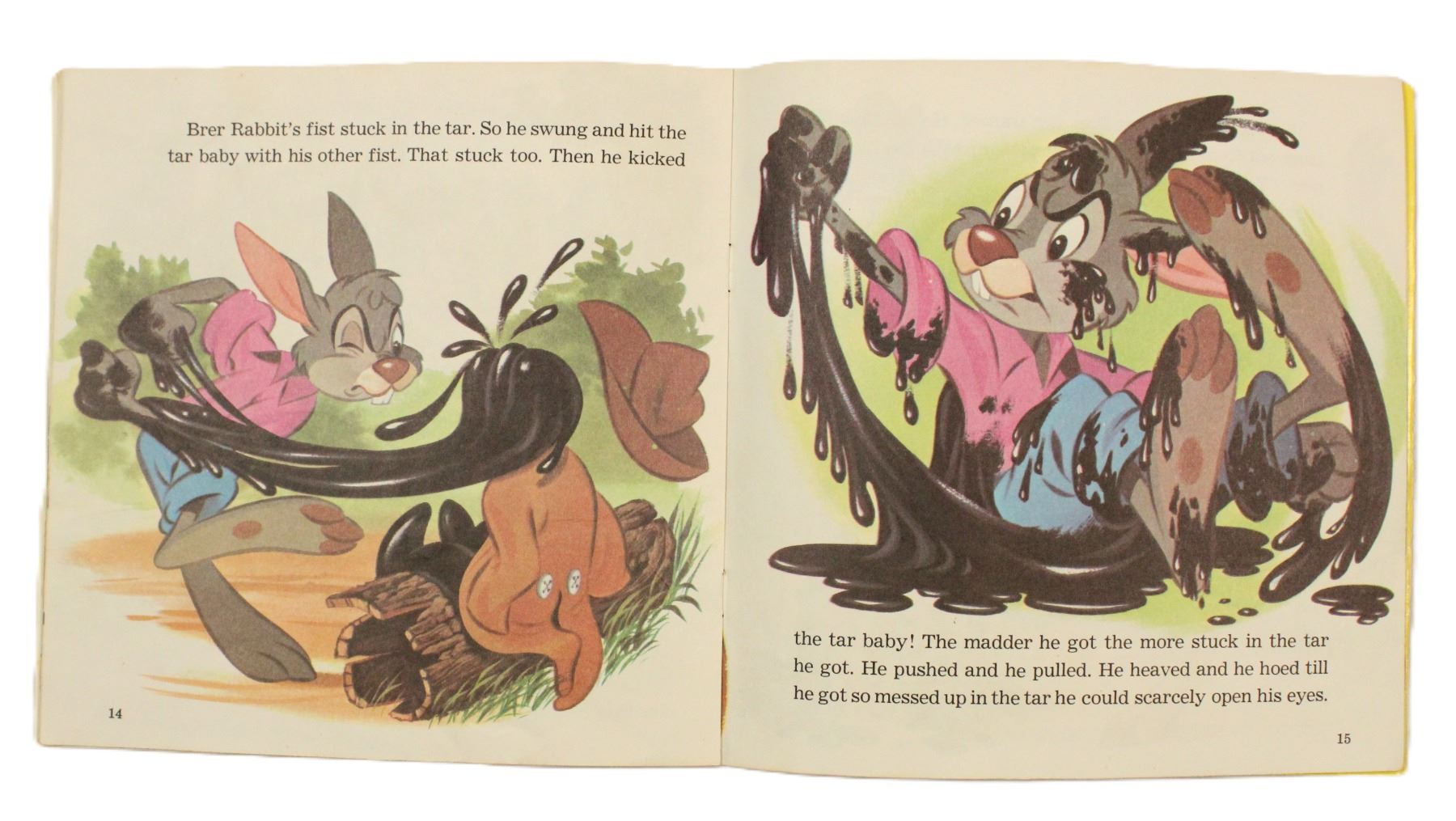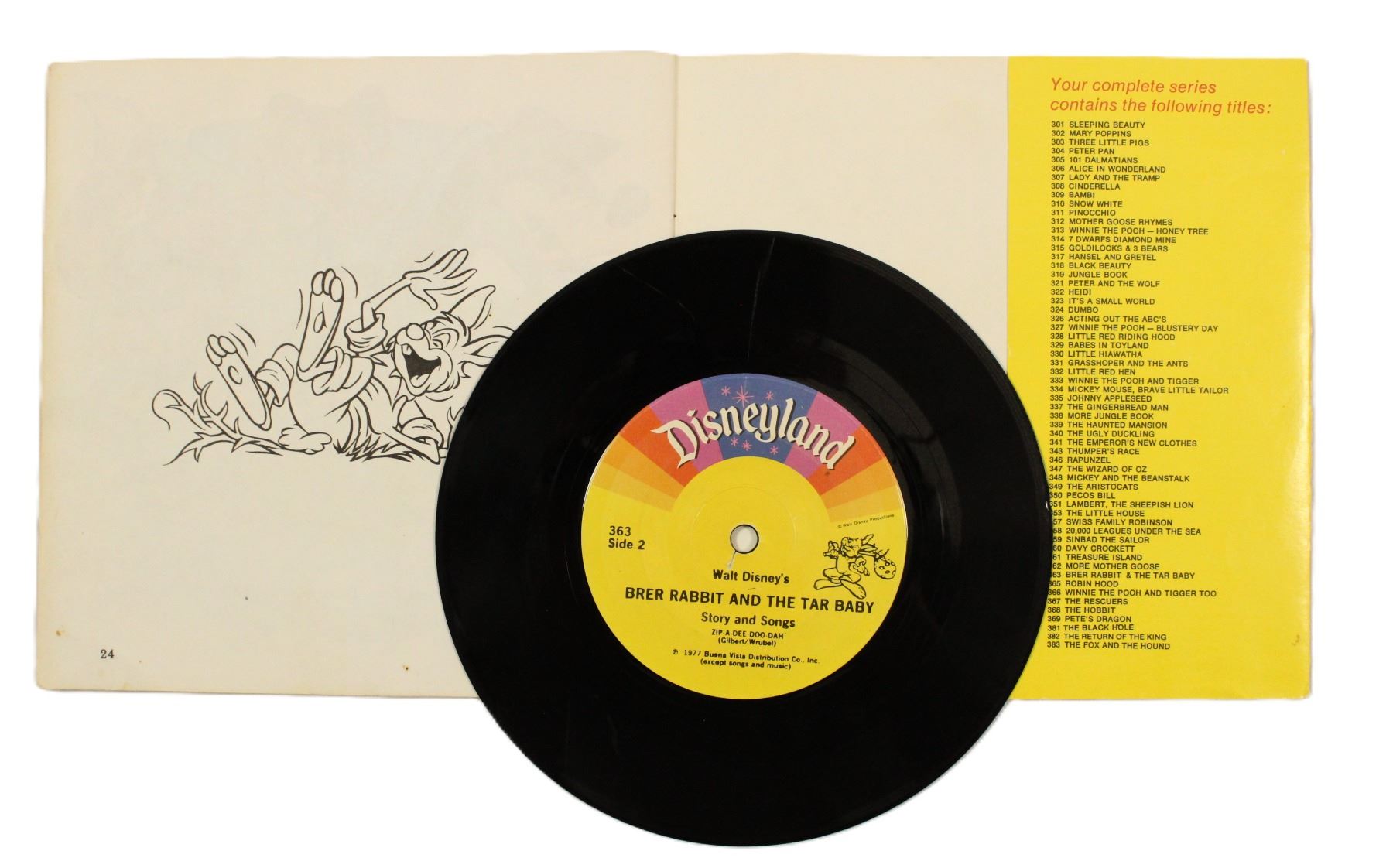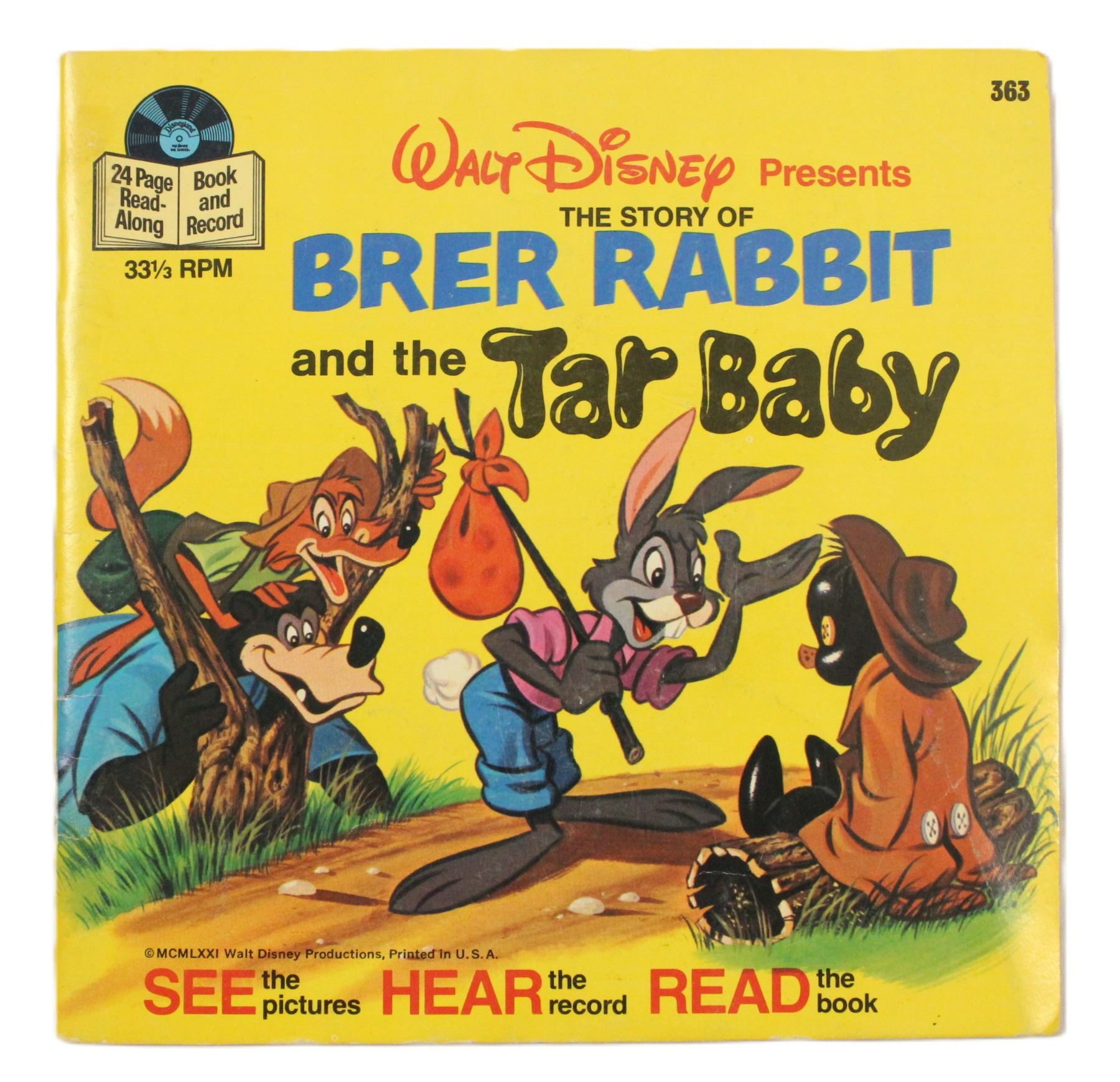 (Disney, 1971) A record with a read-along storybook telling the story of "Brer Rabbit and the Tar Baby." The twenty-four page book includes a 6.75" diameter record in the back pocket. Measuring 7.25"x 7.25" the book is in great condition with minimal wear on the cover from use. The book pages are in great condition. The record plays and is in good condition with one scratch on side 2 that causes a noticeable but non-detracting pop in the audio.